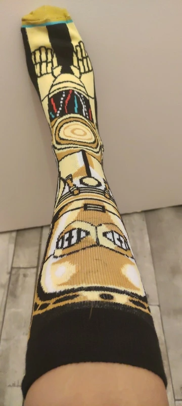 хорошие носки, вообще как гольфы, мне на 43,5 легко налезли, правда рисунок на одну сторону на обоих носках