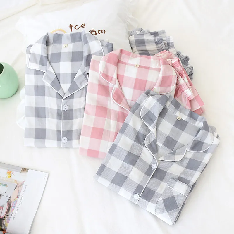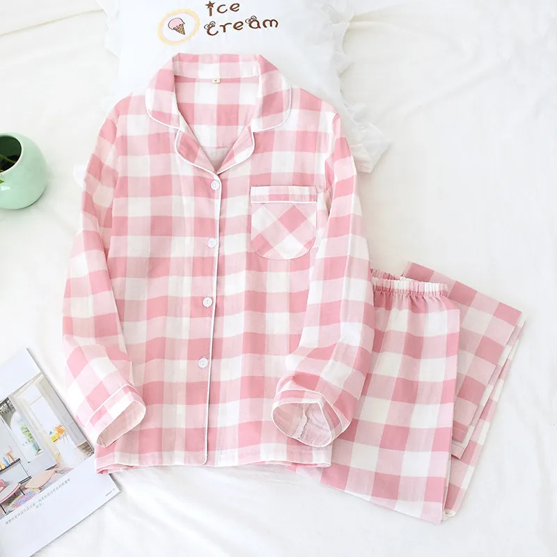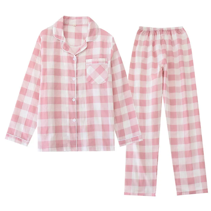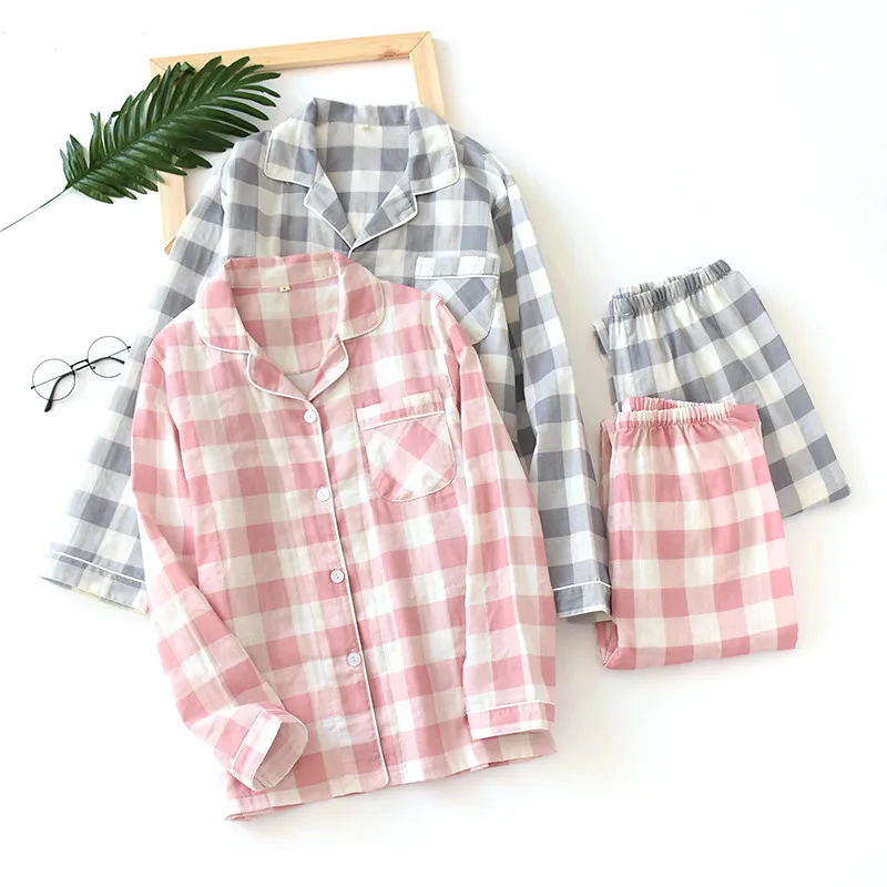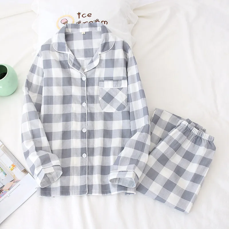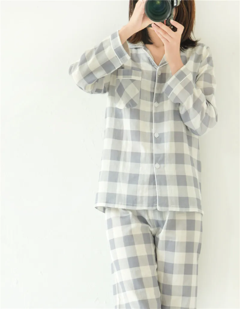 Мужские и женские двухслойные газовые пижамы из чистого хлопка с длинным рукавом, пижамы для влюбленных, клетчатая пижама с принтом размера плюс, пара 2 шт.