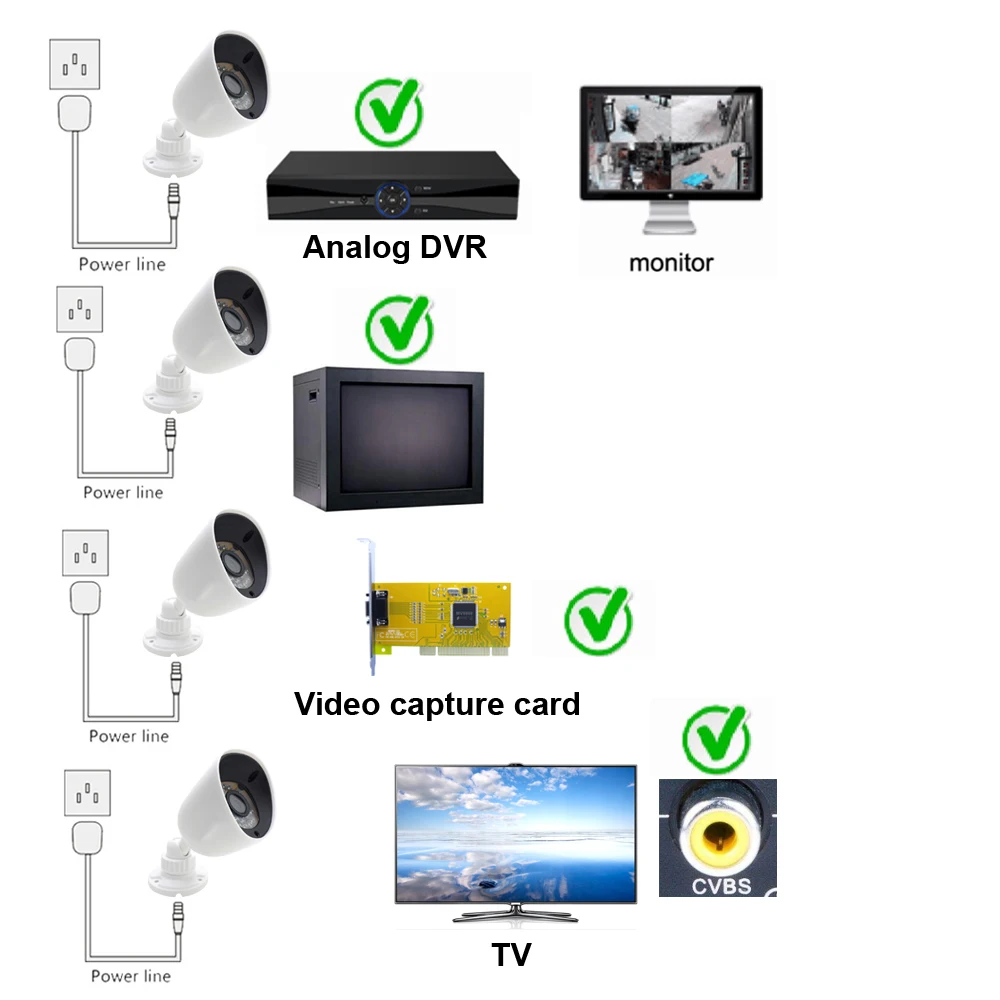 1. Мне нужно подключить к телевизору (Подключено через видеокабель BNC) 2. Мне нужно подключиться к аналоговому DVR (не могу определить, поддерживает ли видеорегистратор новейшие камеры, но выберите меня правильно.) 3. Поддержка подключения к AHD DVR, поддержка подключения к обычному DVR 4. Поддержка монитора подключения