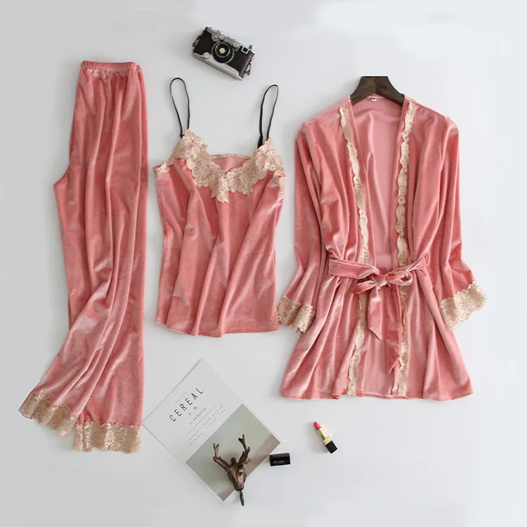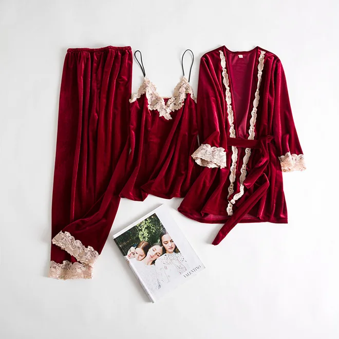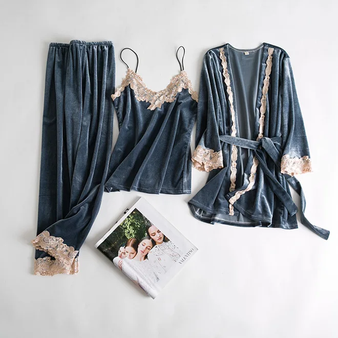 Зеленый велюровый Пижамный костюм для женщин, пижама из 4 предметов, рубашка и штаны, комплект для сна, Осенний теплый халат, ночная рубашка, бархатная Пижама, домашняя одежда