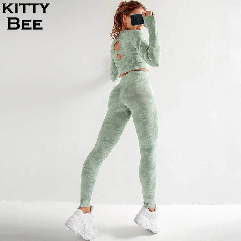 Женский комплект для йоги, бесшовный спортивный костюм, женский спортивный костюм для фитнеса, камуфляжный спортивный костюм с длинным рукавом, комплект из 2 предметов, спортивная одежда для женщин