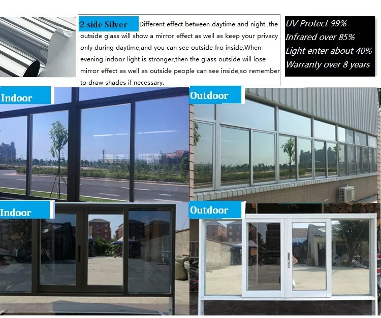 Купить декоративную пленку один из способов зеркальной серебряной оконной пленки серии являются высоко отражающие оконные пленки, которые улучшают дневную конфиденциальность. Если односторонняя зеркальная оконная пленка устанавливается на окно, она придает окну зеркальный отражающий вид на внешней стороне вашего здания. Если вы хотите конфиденциальность от нежелательных зрителей, пока вы все еще можете смотреть в окно и наслаждаться пейзажем, этот фильм будет соответствовать вашим потребностям. Тем не менее, есть важный факт, чтобы отметить о односторонней зеркальной пленке. Как следует из названия, зеркальный эффект работает только в одном направлении. Только боковая сторона с наиболее подверженным воздействию светильник будет иметь зеркальный вид, в то время как с другой стороны вы сможете увидеть. Например, в дневное время солнце делает внешнюю поверхность намного ярче, чем внутреннюю часть здания, поэтому наружная часть окна (Сторона, которая подвержена воздействию солнечных лучей) будет выглядеть как зеркало, давая прохожим обзор ничего, кроме их собственного отражения, В то время как люди на противоположной стороне будут иметь возможность просматривать. В отличие от этого, в ночное время Внутреннее освещение вашего дома или офиса позволит людям снаружи видеть внутри, В то время как вам будет труднее видеть, потому что внутренняя часть будет значительно ярче, чем снаружи. Это, к сожалению, неизбежно, так как прозрачный характер оконных пленок делает физически невозможным одностороннюю зеркальную пленку для работы как днем, так и ночью. Односторонняя зеркальная оконная пленка серебристого цвета как внутри, так и снаружи. Серебро использует свой низкий Видимый светильник, чтобы добавить к зеркальным эффектам.