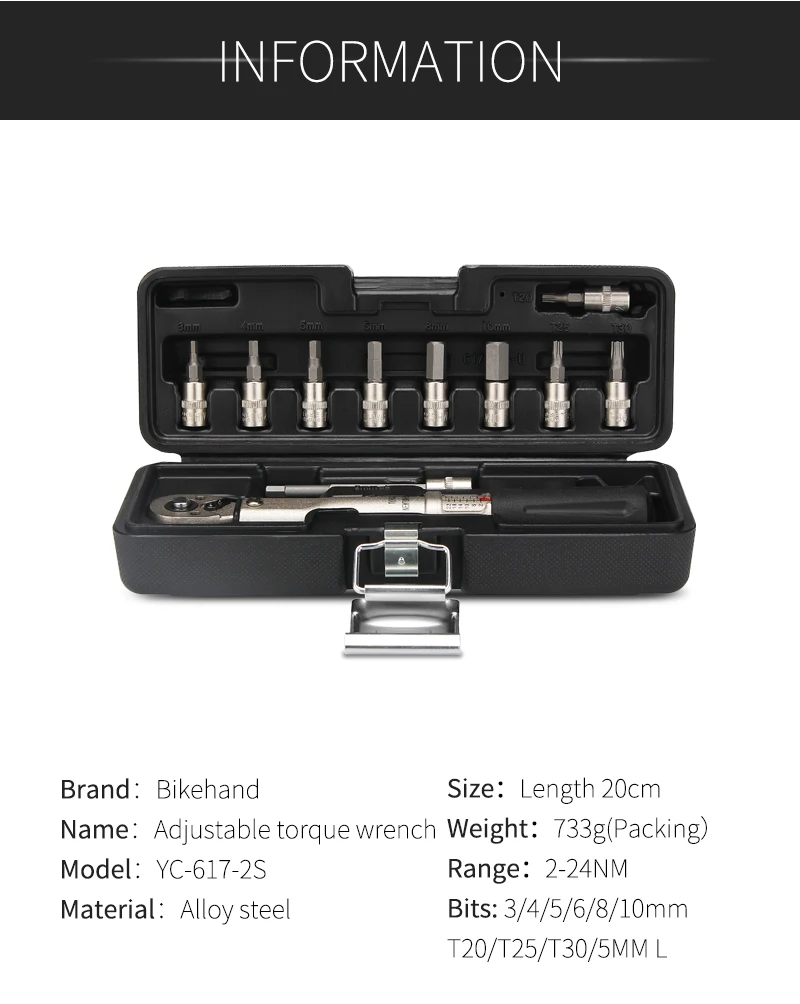 Ручной велосипед, Кита/Тайвань Профессиональный велосипед инструментыНеобходимый инструмент для велосипеда: при слишком большом затягивании детали велосипеда деформируются. Слишком маленький крутящий момент означает, что детали ослаблены. Динамометрический ключ для велосипеда-незаменимый инструмент для установки болтов и велосипедных деталей.Поставляется с качественным набором бит: все самые распространенные биты входят посылка для вашего удобства. Лучшим бит является более длинный шестигранный ключ 5 мм, который позволяет легко доставать болты.Диапазон крутящего момента: 2-24 нм, который покрывает Большинство деталей велосипедаБольше информации:Поставляется с манометром, идеально подходит для углеродных деталей велосипедаНабор для фиксации крутящего момента 1/4 дюйма,Диапазон крутящего момента: 2-24 нмДопуск: точность +/- 4%Шестигранные ключи 3 /4 / 5 / 6 / 8 / 10 мм, плюс шестигранный ключ длиной 5 мм для удобства использованияT20/ T25/T30 крутящие моментыВысокое качество. Отлично подходит для запчастей или болтов велосипеда. (Примечание: Пожалуйста, не пытайтесь использовать дешевые качественные инструменты, они повредят детали)Сделано в ТайванеПримечание: прекратите поворот, когда почувствуете «щелчок». «Щелчок» означает, что крутящий момент достиг заданного значения.