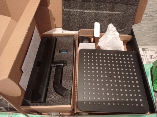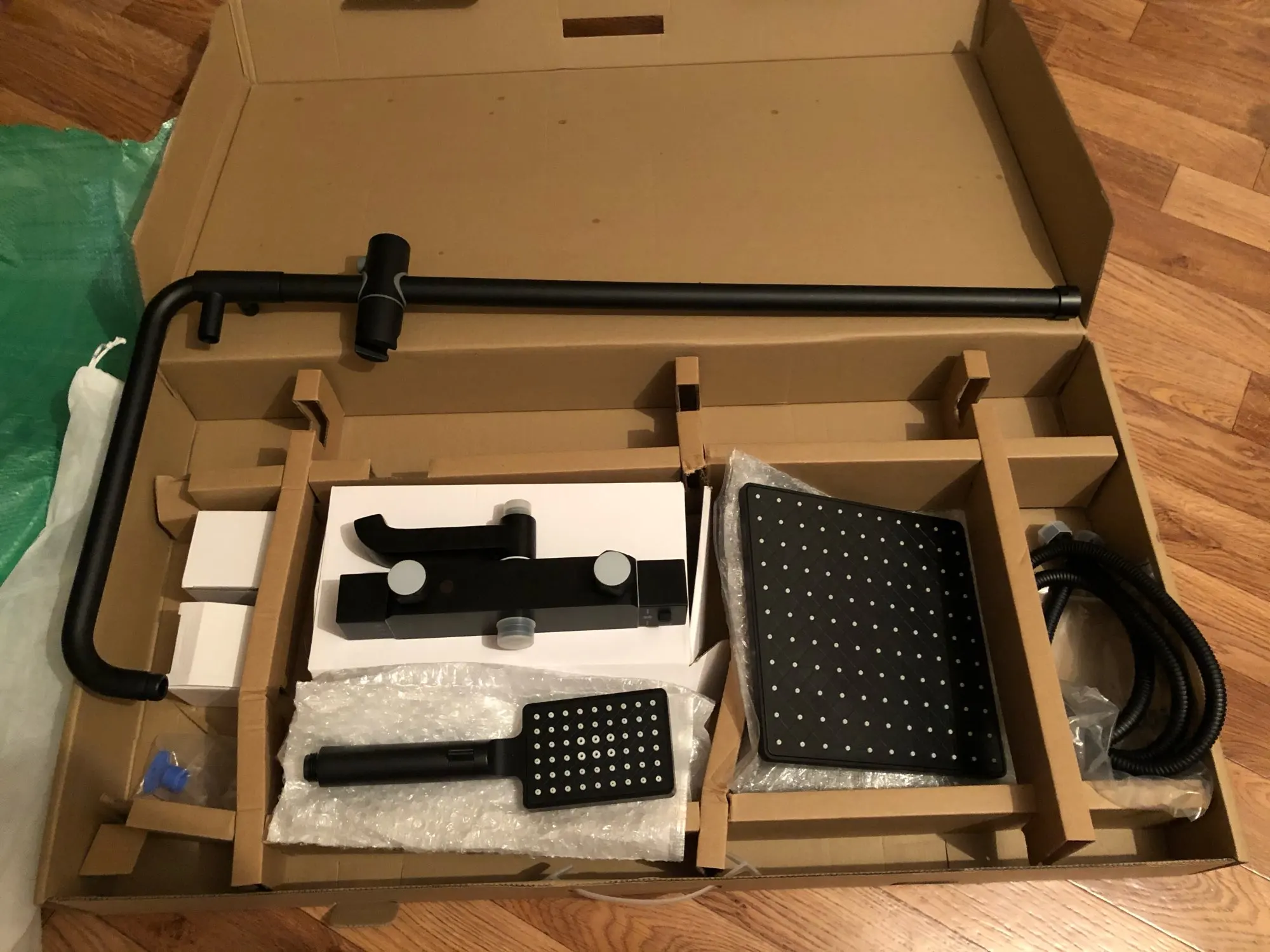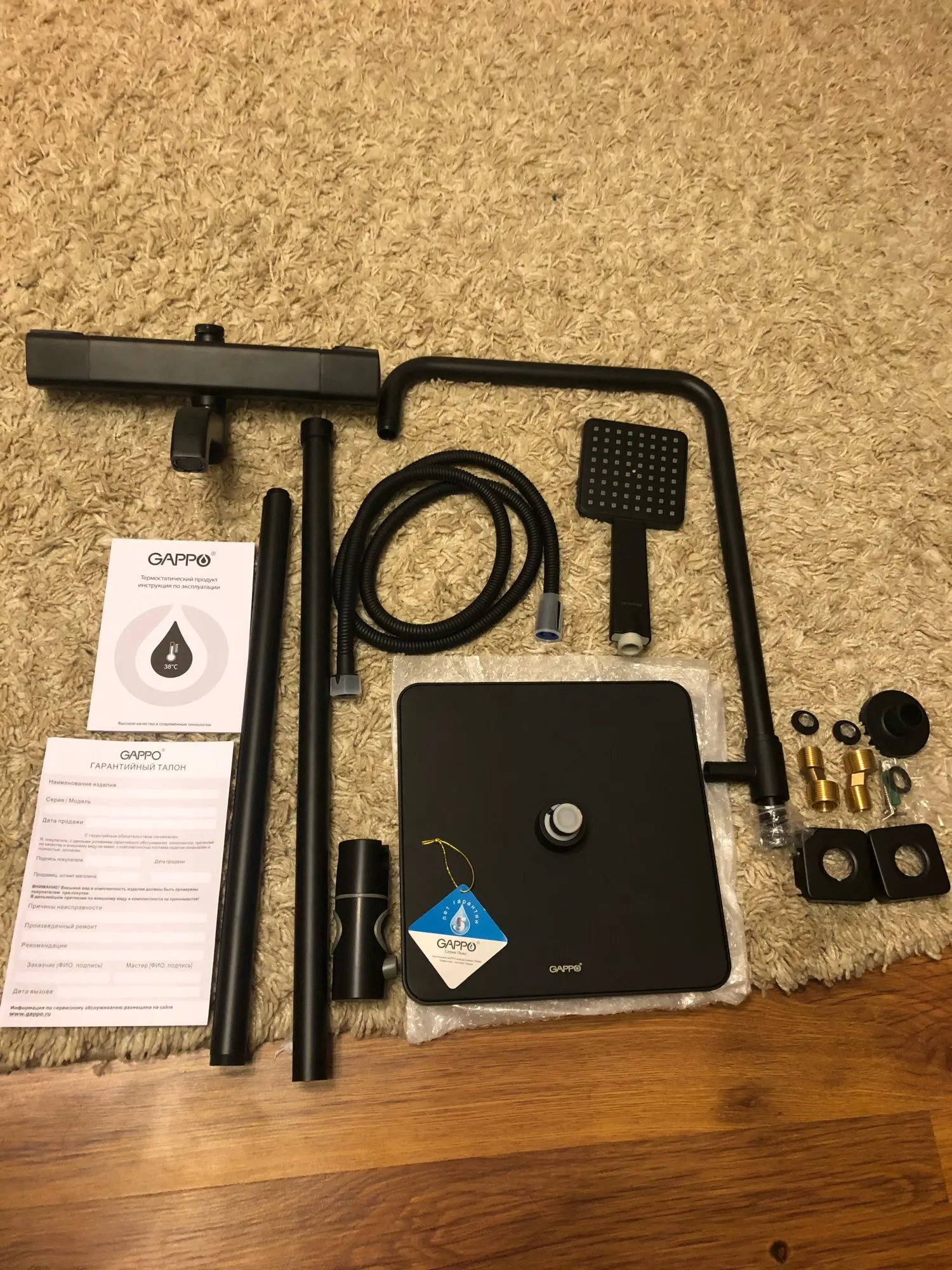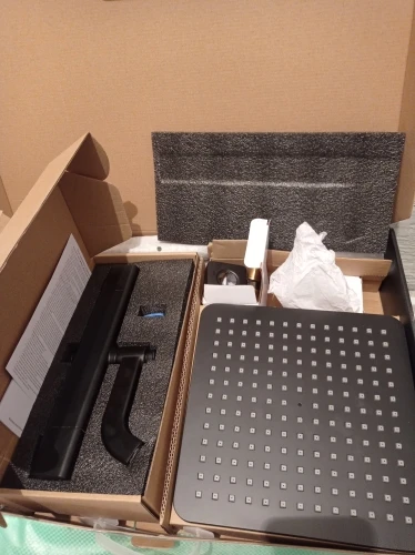 Доставка в течении 10 дней из РФ. Упаковано было в пакет, привёз курьер. Коробка пришла целая, что очень порадовало. Упаковка конечно шик) все в коробочках на своих местах и завёрнуто бумагой. Сам душ очень красивы чёрного матового цвета. У смесителя присутствуют зазоры у ручек переключения, как то собрано не очень. В остальном товар на 5, можно рекомендовать к покупке! После установки по возможности дополню отзыв. Продавцу спасибо