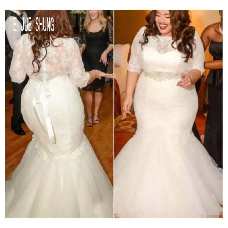 Женское свадебное платье-Русалка E JUE SHUNG, кружевное платье с полурукавом и глубоким круглым вырезом, свадебное платье на пуговицах