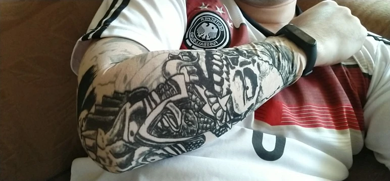 я дохлая тётка 55 кг и на меня этот рукав впритык. в верхней части руки прямо чувствуется, как жмёт. не знаю, сможет ли его номить мужик нормального веса и комплекции. издалека выглядит прикольно. заказала посмотреть, что это вообще такое. посередине, прямо по центру, идёт явно видная чёрная полоса, видимо от стыка краски на двух половинах, которая портит весь вид. сзади тоже есть эта полоса, но менее заметная. есть место, где размазана краска. только низкая цена оправдывает это безобразие. так что рекомендовать не могу. если детям понравится, возможно закажу ещё, но уже в другом месте.