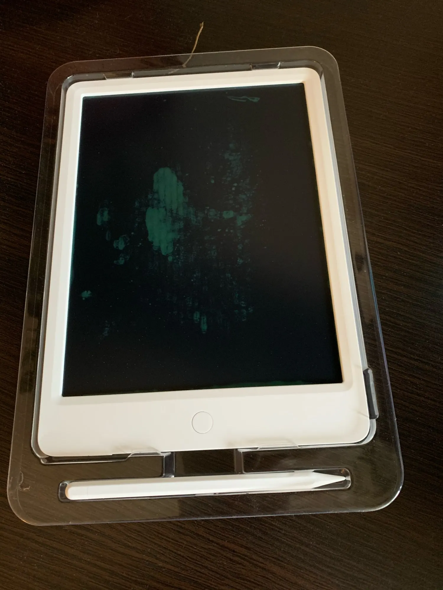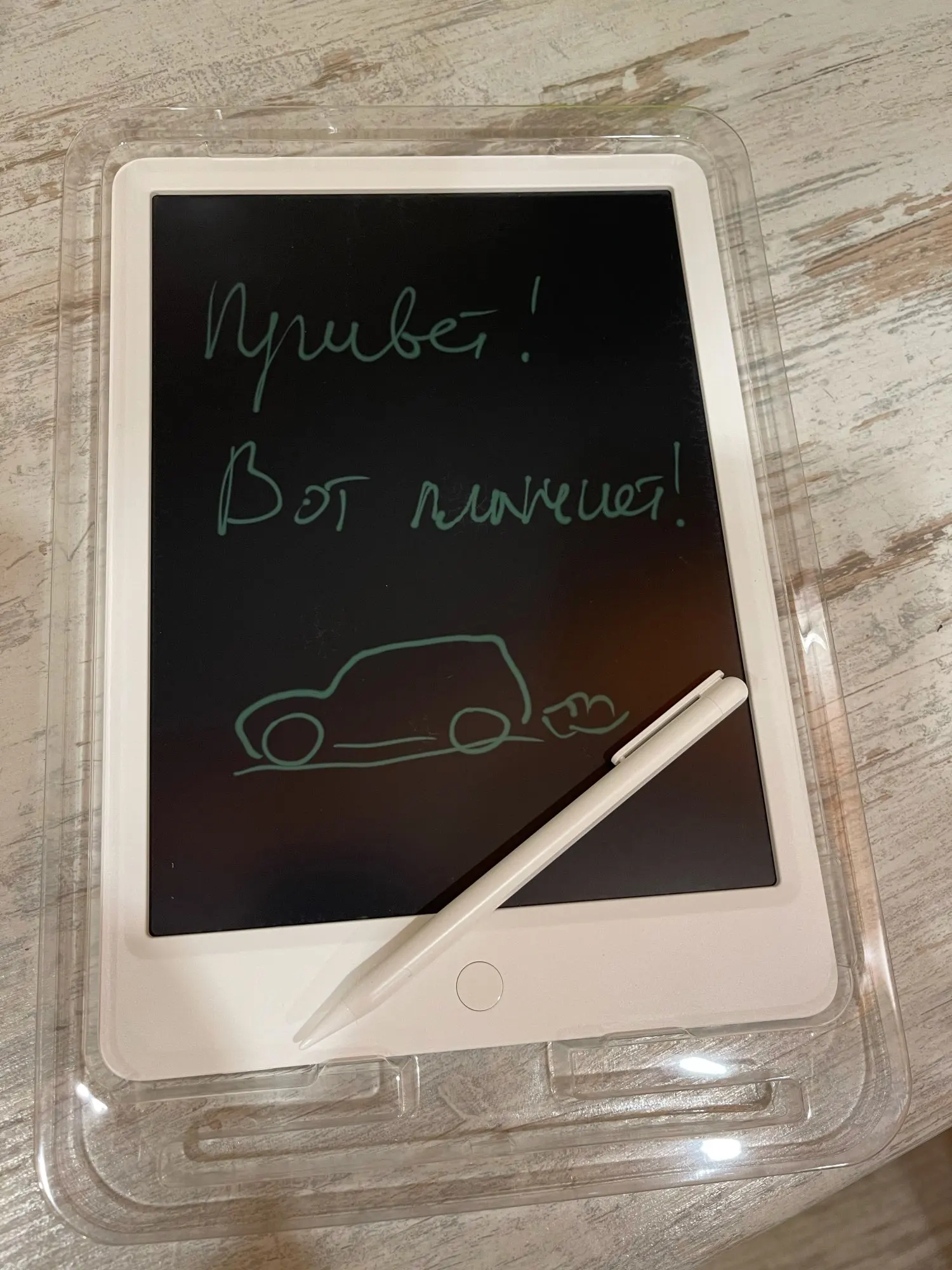 Планшет шел три недели до Москвы, переживал что целым не доедет, но все в порядке, думаю ребёнку понравится. Ручка рисует, кнопка стирает, рисунки чтобы вы понимали никуда не сохраняются, нарисовали и всё. Ещё положили промокод на два доллара