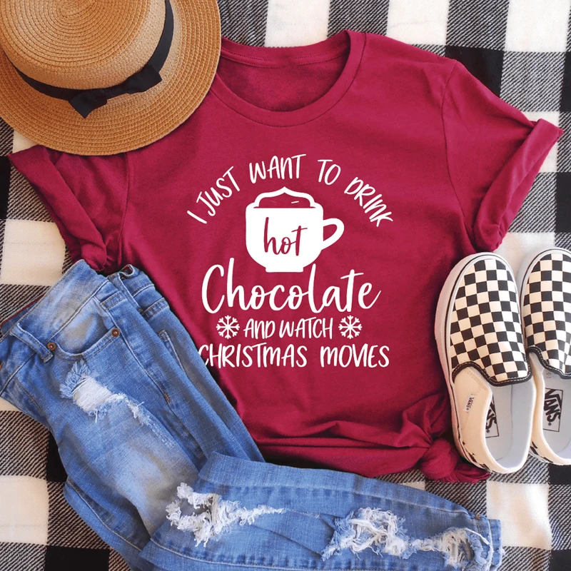 Футболка унисекс, я просто хочу пить горячий шоколад и смотреть рождественские фильмы, модная красная одежда, хлопковые топы, Повседневная футболка с графическим рисунком