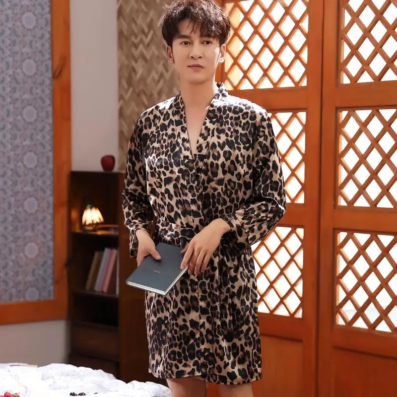 Мужские леопардовые шелковые атласные халаты, пижамы с длинным рукавом, одежда для сна в отеле, кимоно, мужской халат для дома, отдыха, Мужская одежда для отдыха, Халат