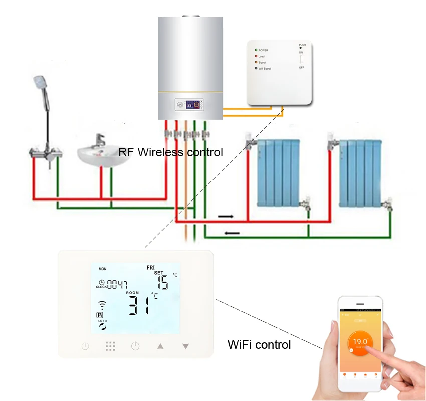 Рабочий анализ термостата Термостат для нагрева газового котла BGL09RF-WiFi имеет функцию беспроводной связи RF и Wi-Fi. Весь набор содержит корпус термостата, приемник и вилку. Когда покупатель получит термостат, он должен установить приемник со своего газового котла. Корпус термостата можно взять в любую комнату, которую вы предпочитаете. И когда покупатель не дома, он/она может использовать телефон для управления термостатом. BGL09RF-WiFi газовый котел нагревательный термостат очень удобен.
