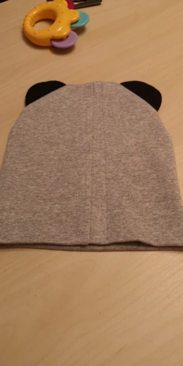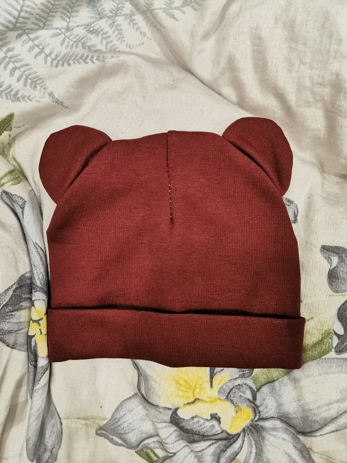 Шапка достаточно плотной ткани, цвет что-то между бордовым и коричневым. На ребёнка 7 месяцев как раз по размеру! К коже приятная. На швах спереди немного видно белые нитки, но это не критично. С продавцом не общалась, шла 2 месяца.