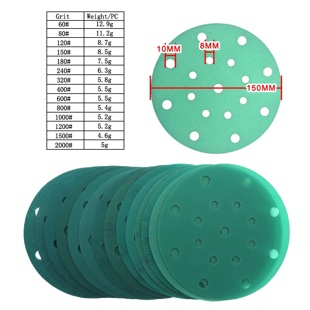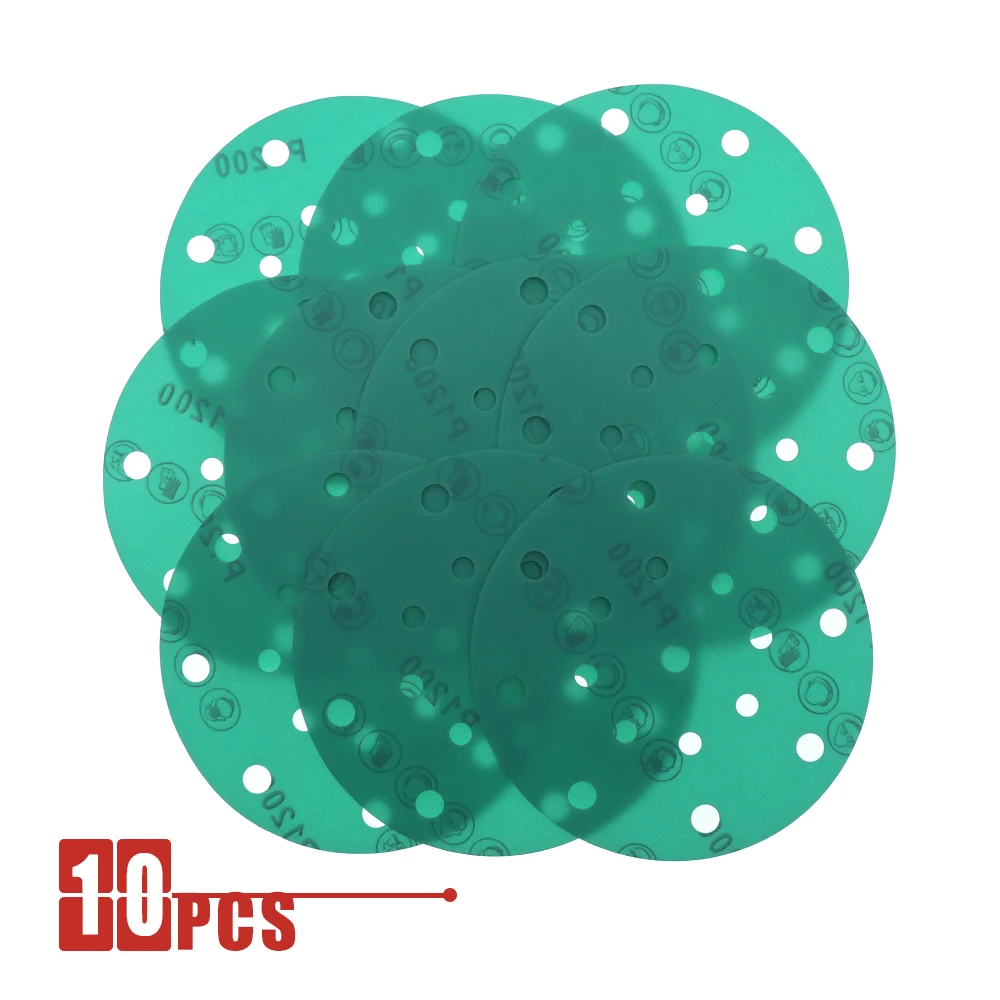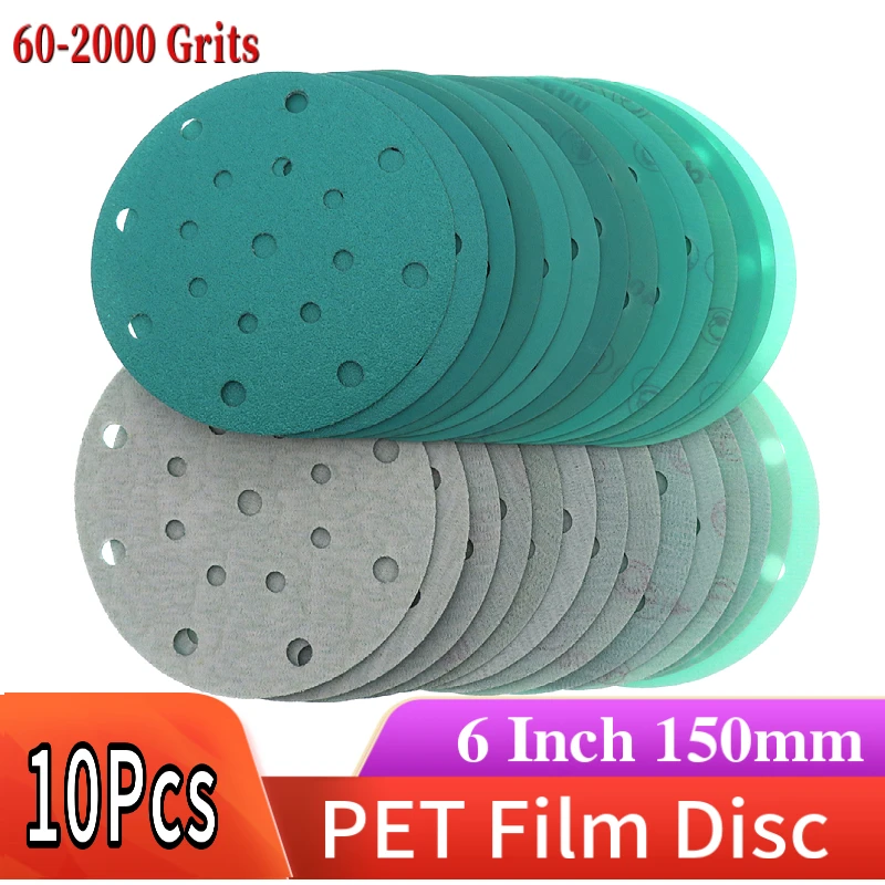 6-дюймовые шлифовальные диски с 17 отверстиями, зернистость 60-2000, высокопрочная наждачная бумага с липучками для влажной сухой наждачной бумаги, ПЭТ-пленка для произвольных орбитальных шлифовальных машин