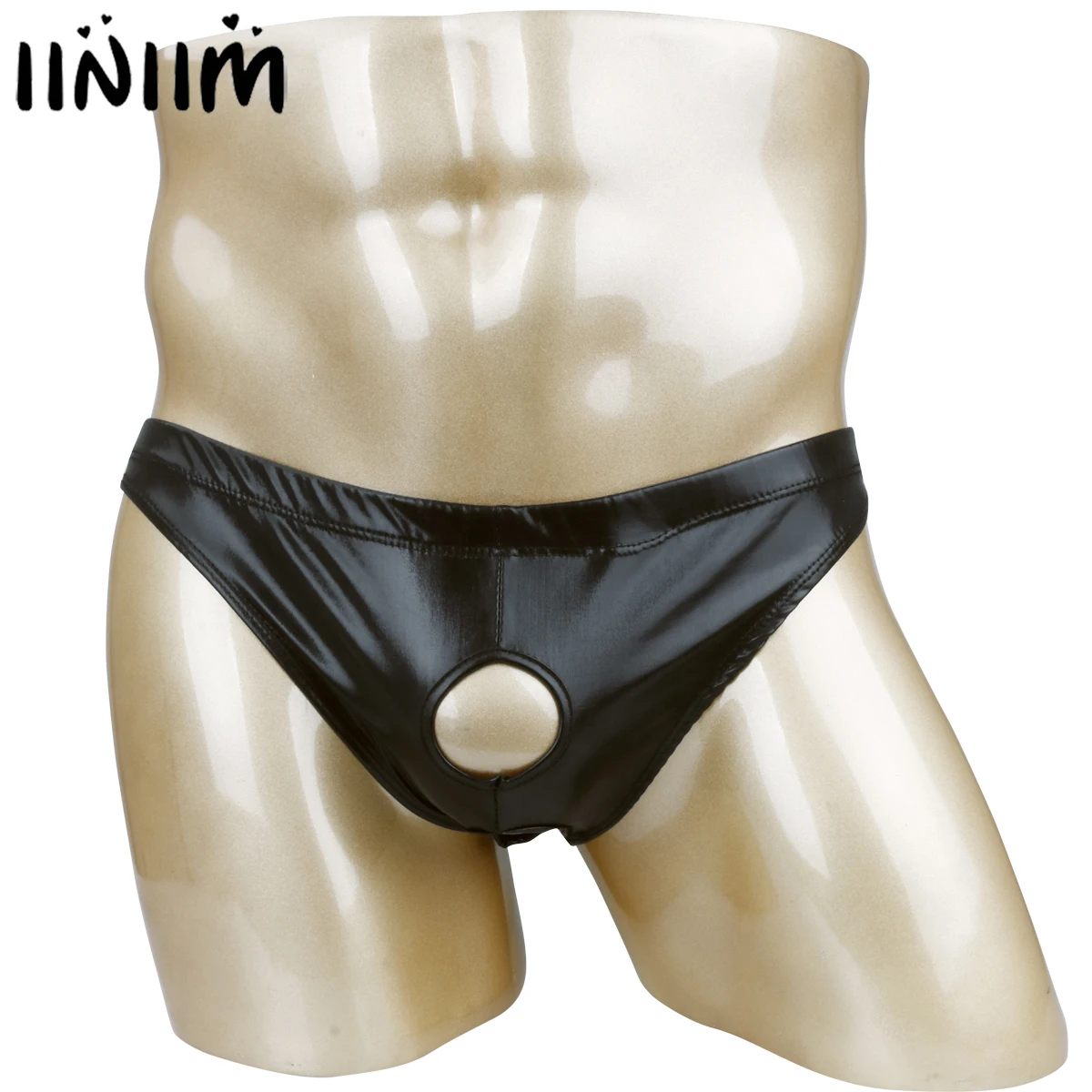 Мужские нижнее белье блестящие с мокрым эффектом кожаное бикини трусы сексуальные открытые попки трусики с отверстиями Homme бандаж латекс нижнее белье