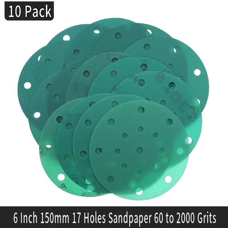 10 шт 6 дюймов 150 мм 17 отверстий наждачная бумага от 60 до 2000 решетки крюк и петля зеленая пленка шлифовальный диск для полировки и шлифования