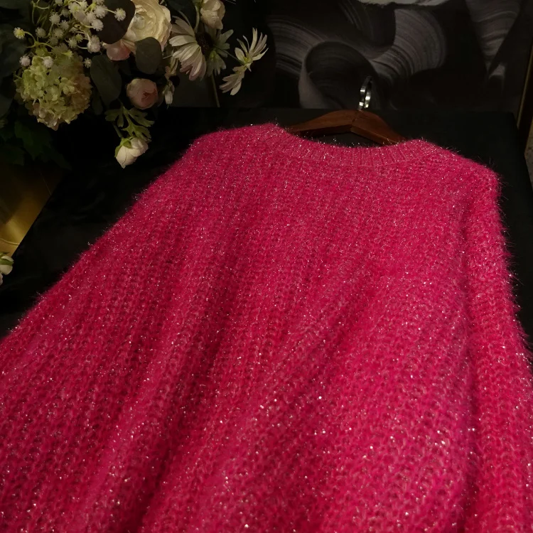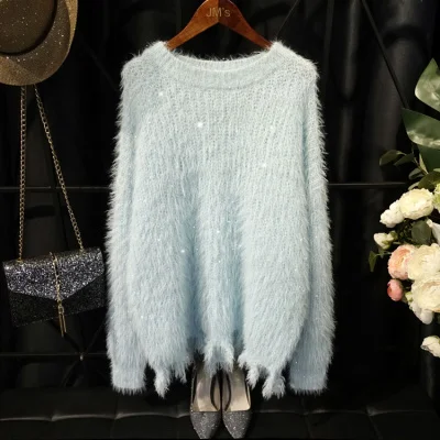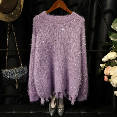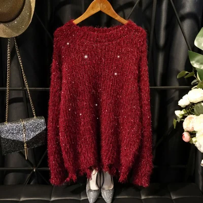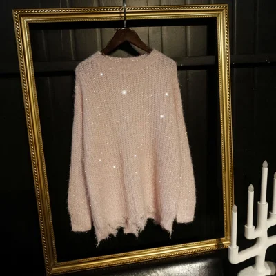 Cakucool для женщин блестящие свитер из люрекса Bling свободные розовый с круглым вырезом в Корейском стиле свитера с разорванными дырами на весну и осень больших размеров Джемперы леди