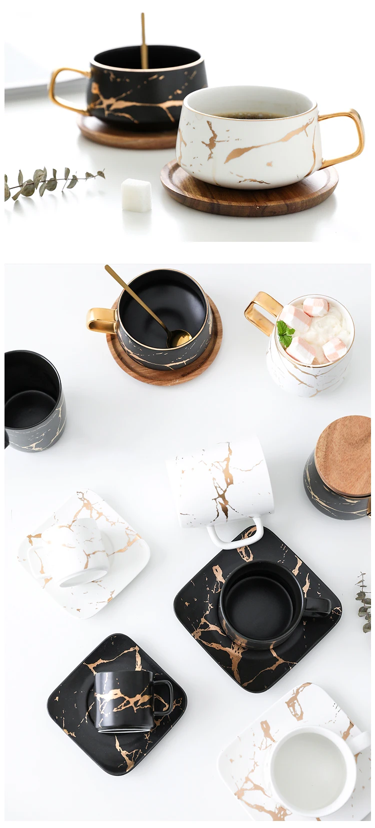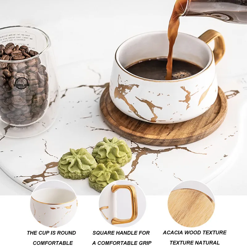 Керамическая кружка с мраморной текстурой в скандинавском стиле, позолоченная ручка, чашка, деревянная крышка, блюдце, кофейная чашка, кружка для завтрака, молока