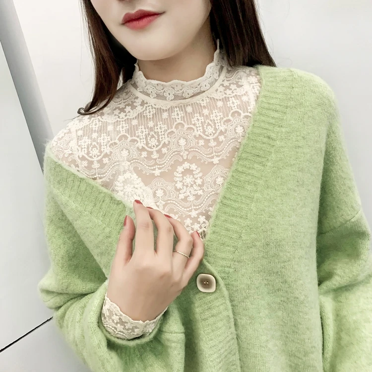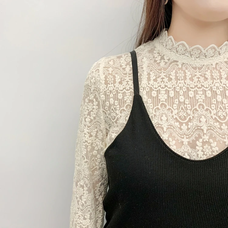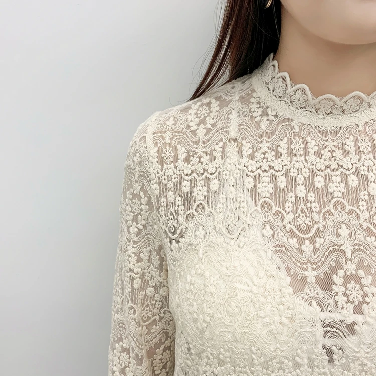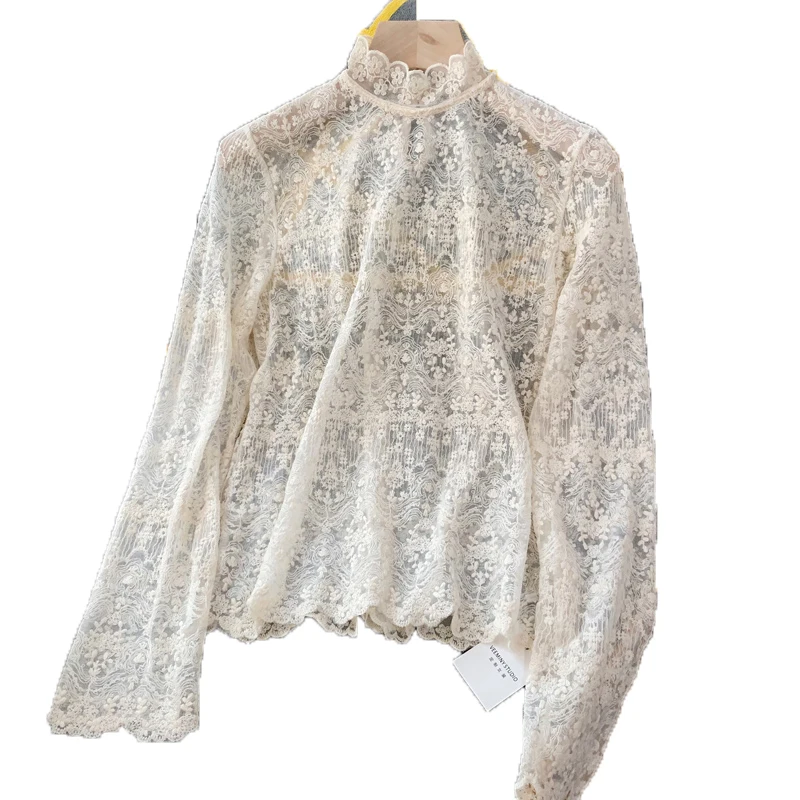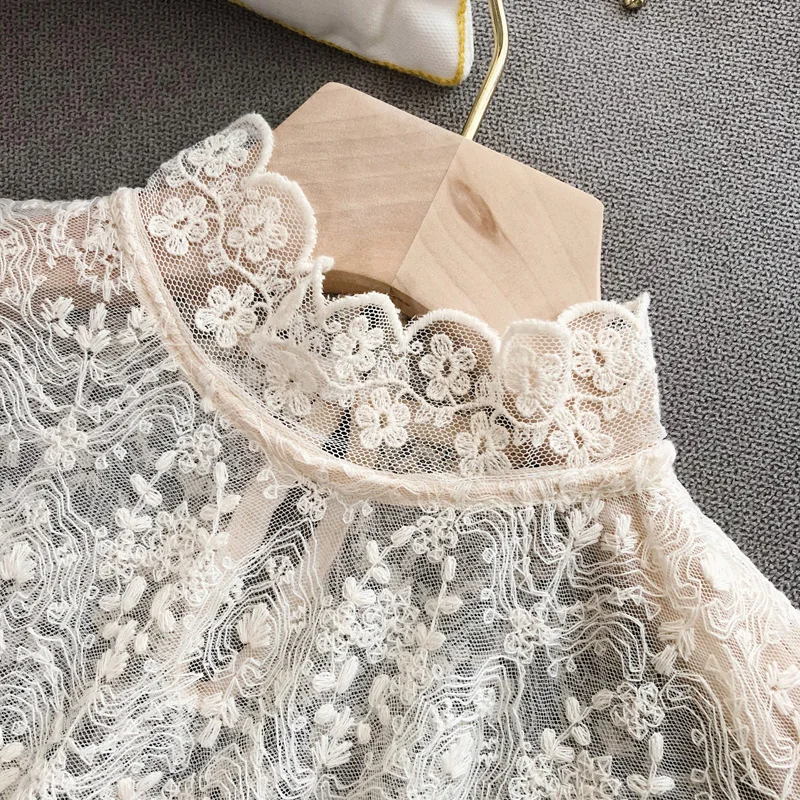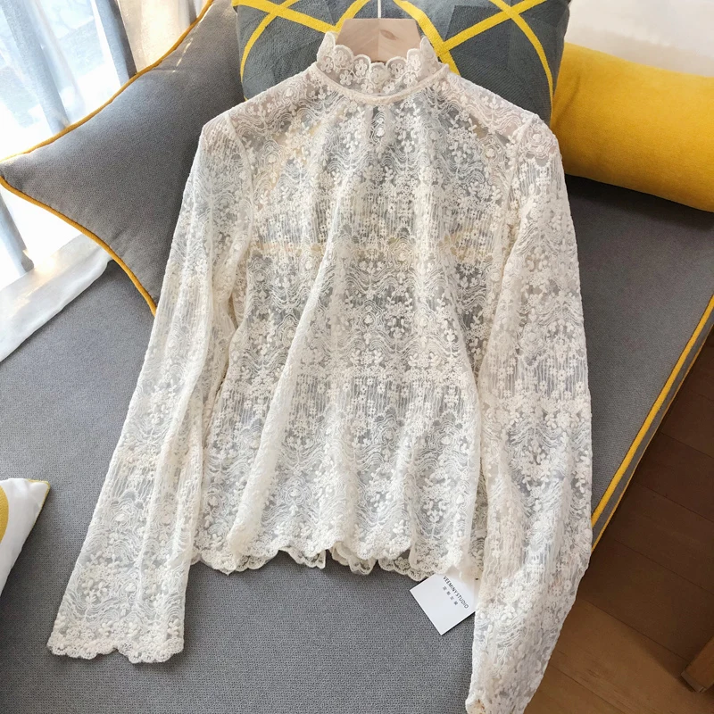Женская кружевная блузка, винтажная универсальная рубашка с высоким воротником, элегантные пуговицы, топы принцессы с расклешенным рукавом, размера плюс