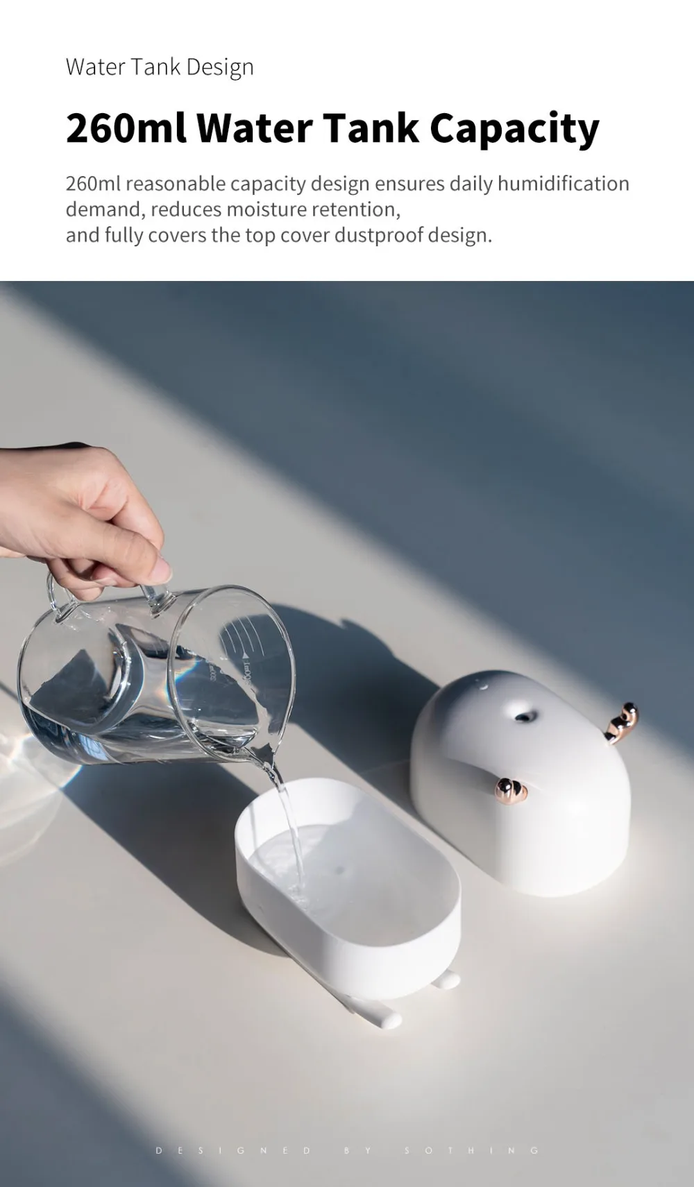 Разумная емкость 260 мл обеспечивает ежедневный спрос на увлажнение, снижает удержание влаги и полностью закрывает верхнюю крышку пыленепроницаемой конструкции