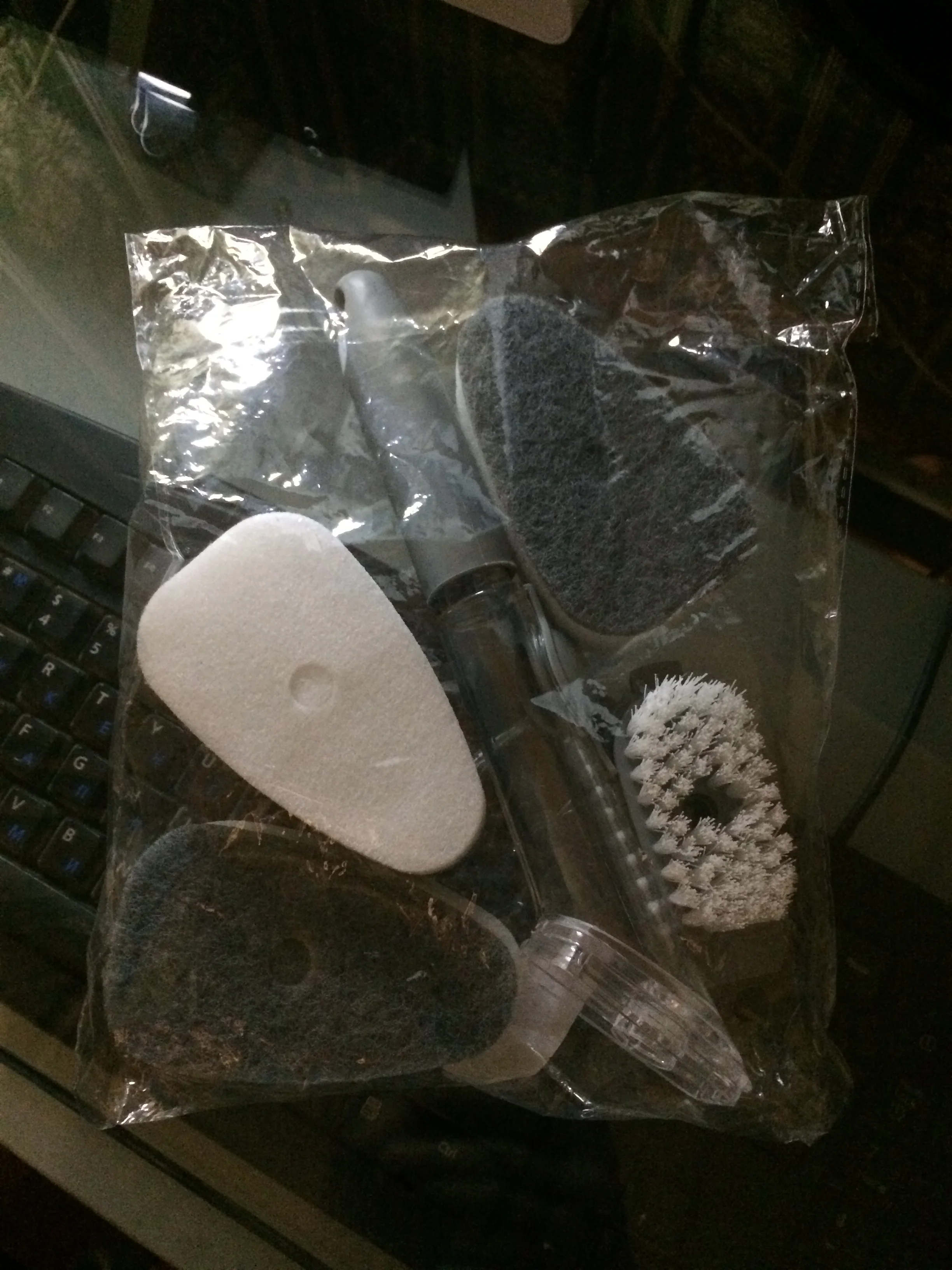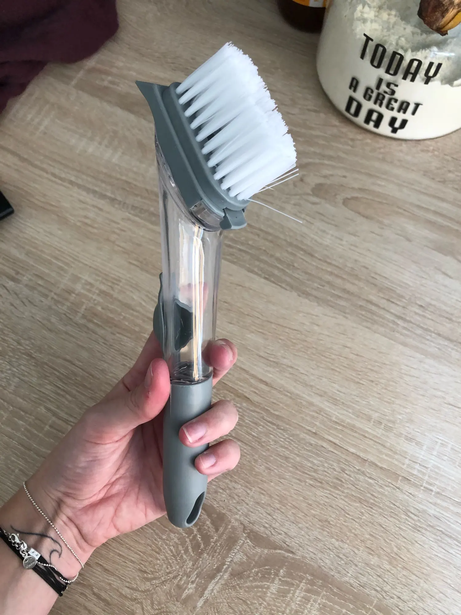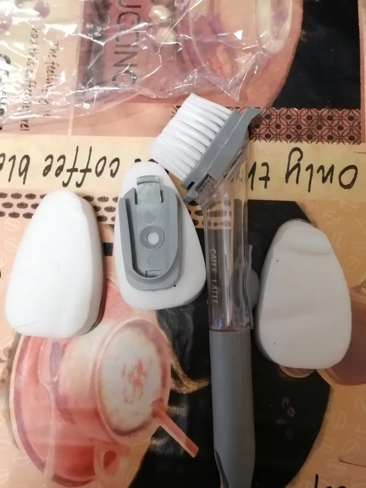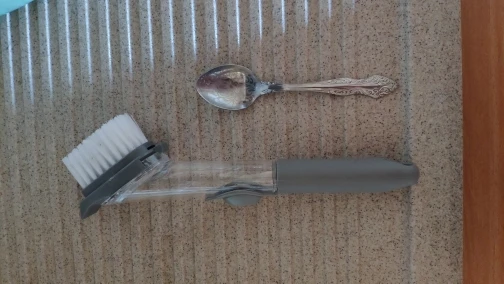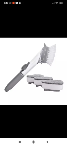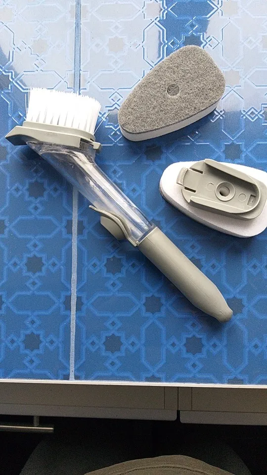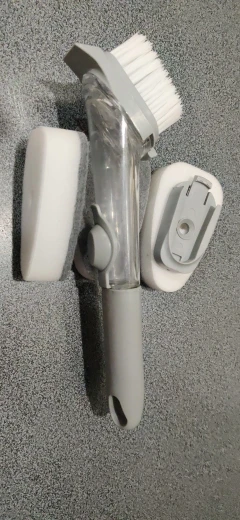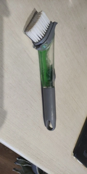 Доставка 15 дней.Удобная щётка.Преимущества губки,не надо надевать перчатки,даже с агрессивными средствами.Щетина средней жёсткости,оттирает хорошо.