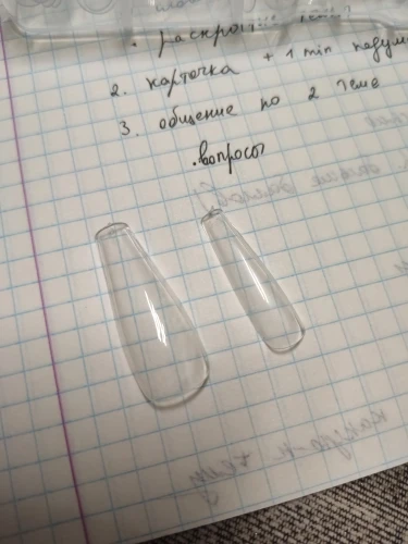 Товар и качество хорошее. 10 различных размеров, правда одни из них потратятся быстрее, в то время когда другие другие вообще не пригодятся. Хорошие, прозрачные. Форма что надо. Правда на многих есть пластиковые заусенцы, но мы их спилим . Ни клея, ни специальных подушечек в комплекте не было. Только ногти. Скраю у узкой части подписан номер