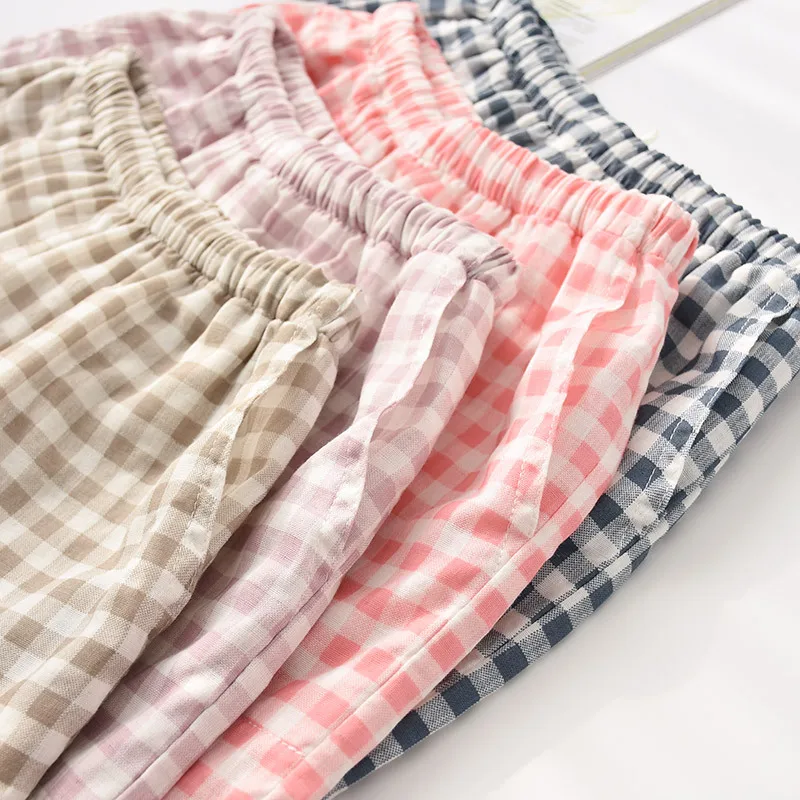 Новые летние шорты в клетку для пар, хлопковые марлевые брюки, одежда для отдыха и сна для женщин, ночные брюки