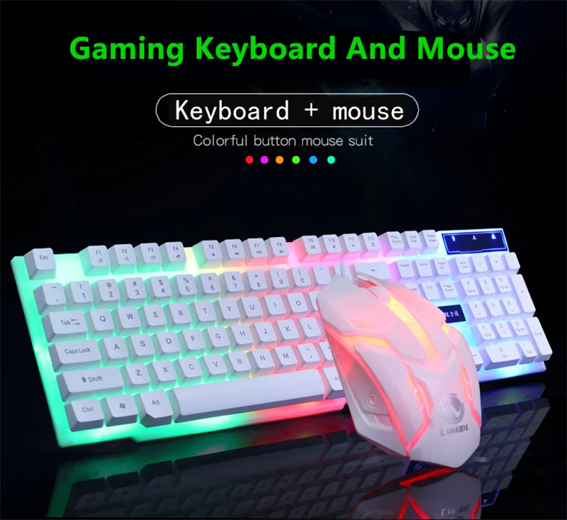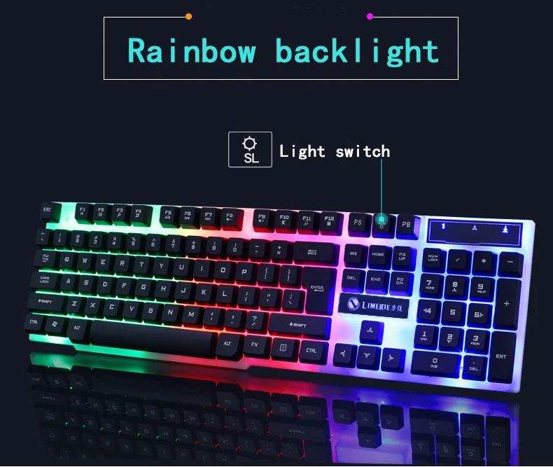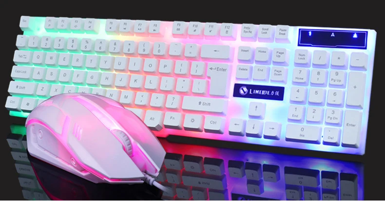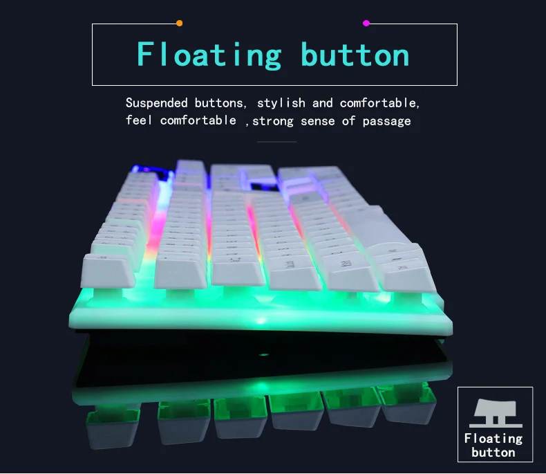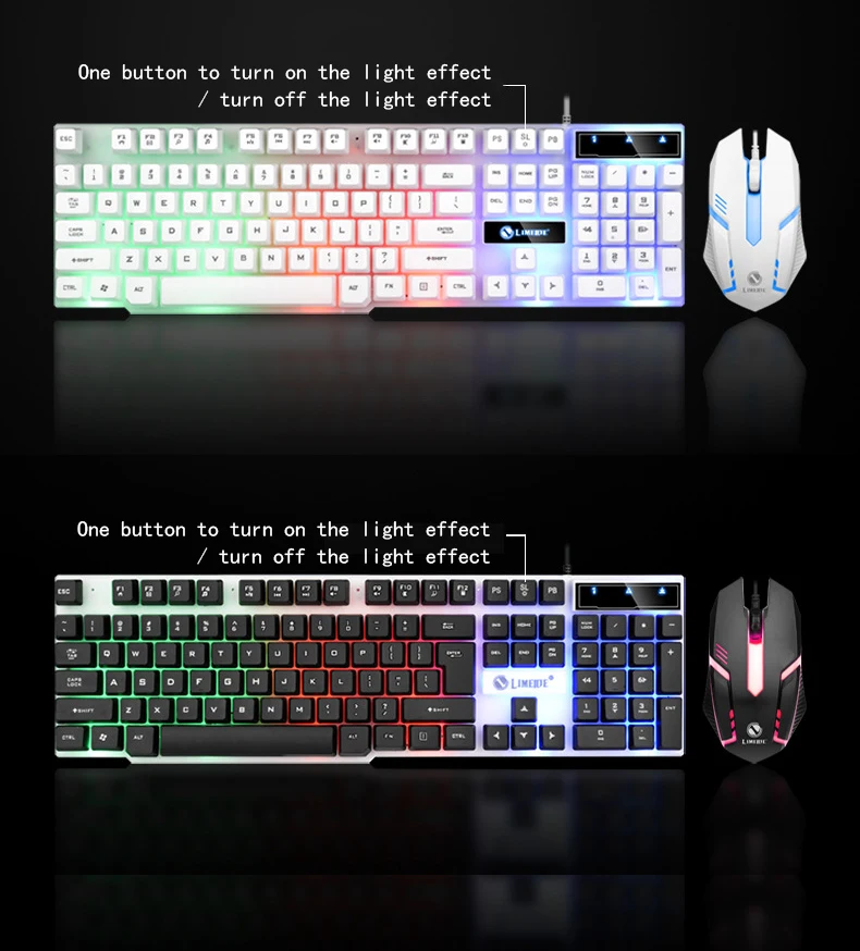 Проводная клавиатура1) эффект радужной подсветки2) плавучие кнопки, механические ощущения3) Крышка Ключа Вогнутая конструкция, удобная на ощупь4) Задняя часть клавиатуры имеет регулируемый дизайн штатива для лучшего опыта.5) одна кнопка, чтобы включить светильник и выключить светильникМультимедийная функция быстрого доступа(1) Fn + F1 = домашняя страница (7) Fn + F7 = следующая песня(2) Fn + F2 = Mail ( 8) Fn + F8 = громкость-(3) Fn + F3 = поиск (9) Fn + F9 = Громкость +(4) Fn + F4 = player (10) Fn + F10 = Mute(5) Fn + F5 = воспроизведение/пауза (11) Fn + F11 = мой компьютер(6) Fn + F6 = Предыдущая песня (12) Fn + F12 = калькуляторПроводная мышь1) мышь имеет встроенный цветной светодиодный светильник.2)3D Противоскользящий роликовый дизайн, эффективно решает проблемуНеточности скольжения, вызванной потом3) Эргономичный дизайн, комфортные ощущения