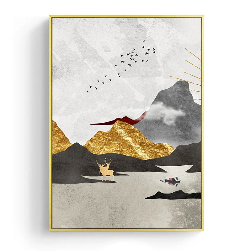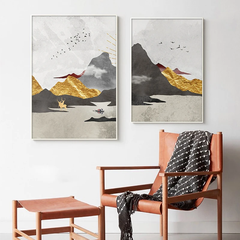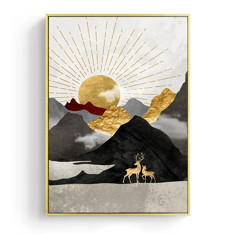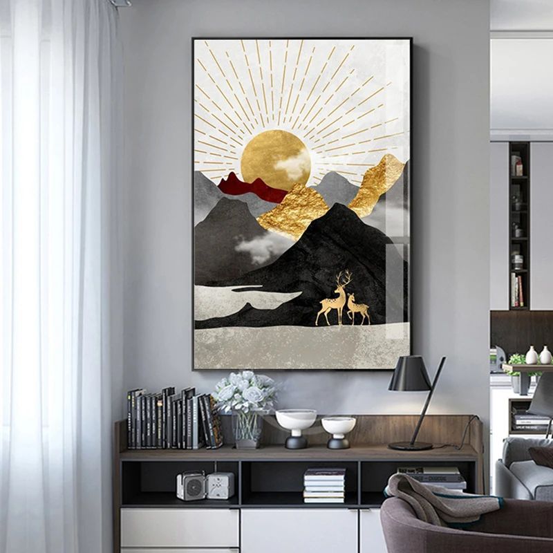 Настенная живопись в скандинавском стиле, абстрактный геометрический пейзаж, горы, постер с золотым солнцем для гостиной