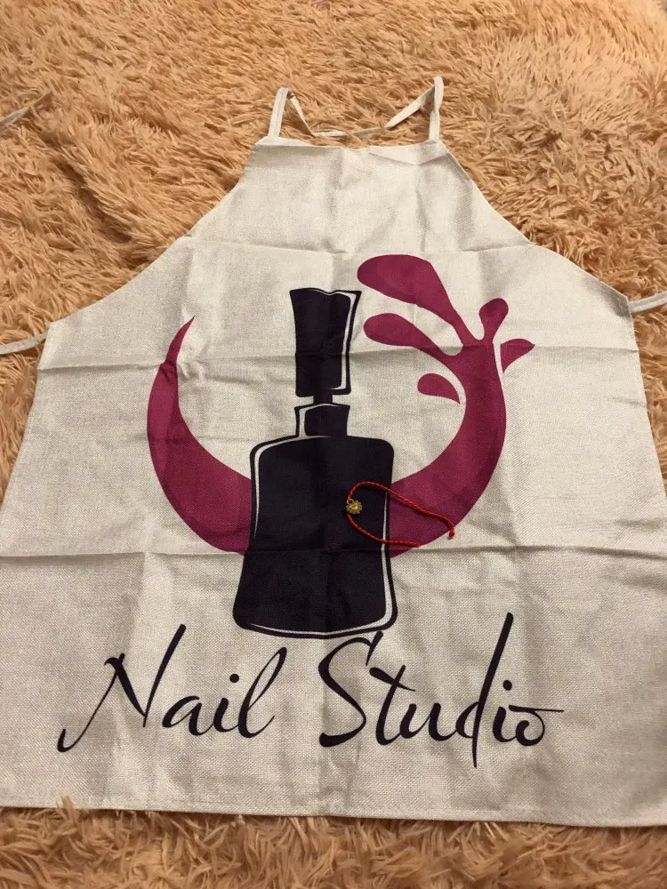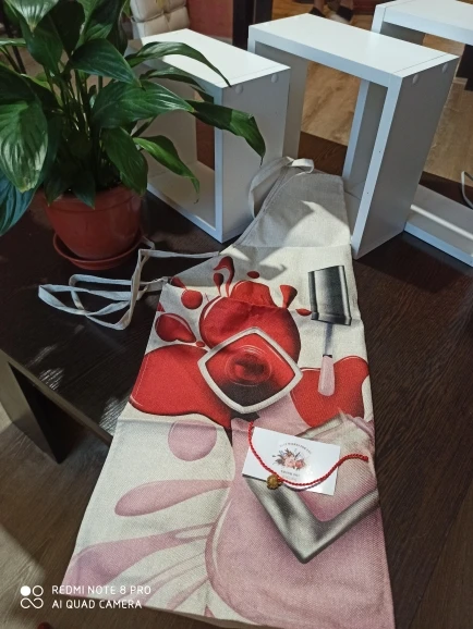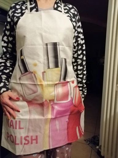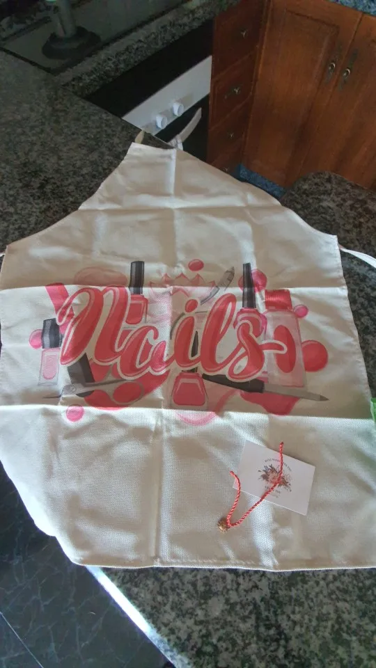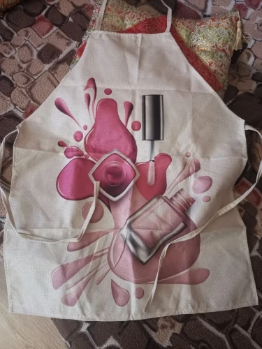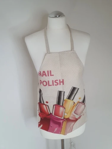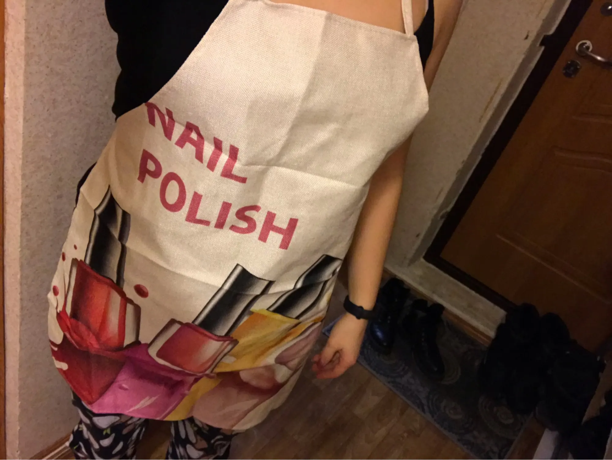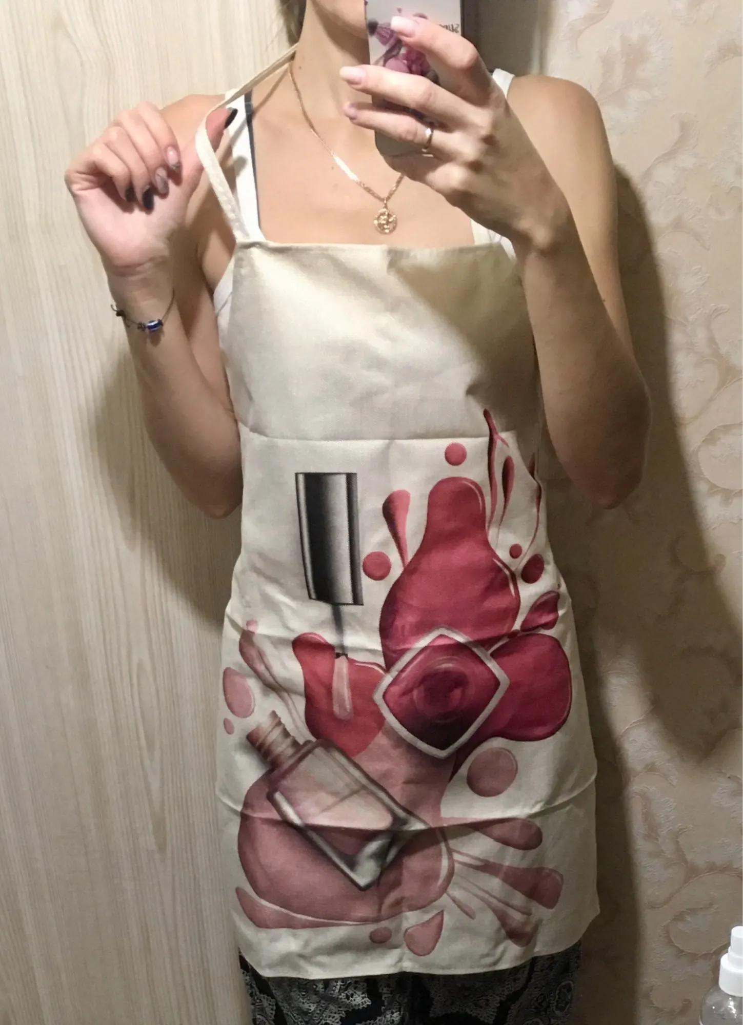Фартук выполнен из плотной ткани(мешковины) Рисунок яркий, швы ровные. Для работы мастеру маникюра в самый раз. Пыль не пройдёт и материалами не испачкаешься. Если для кухни, конечно не вариант, очень плотный. Доставка до Москвы около месяца. Продавец в подарок положил браслет из красной ните и открытку. Спасибо!