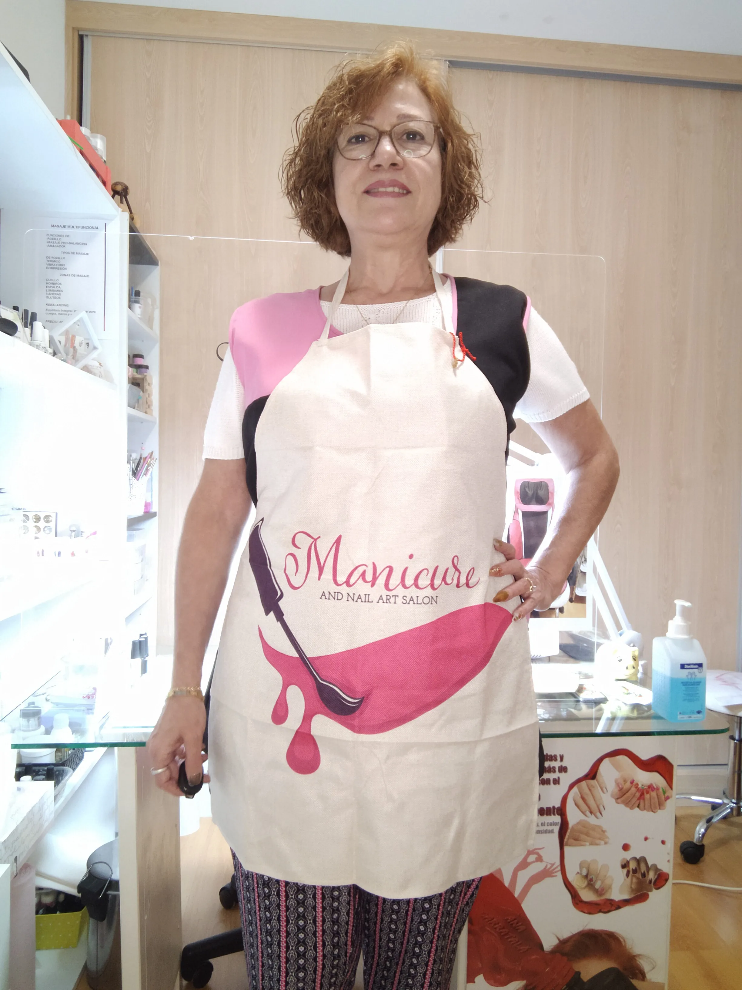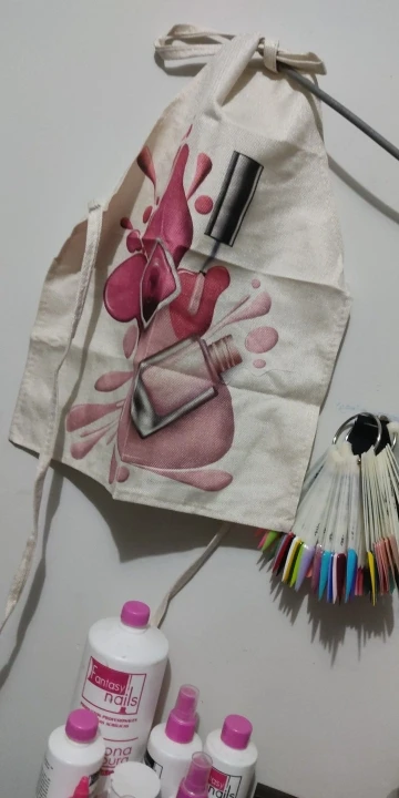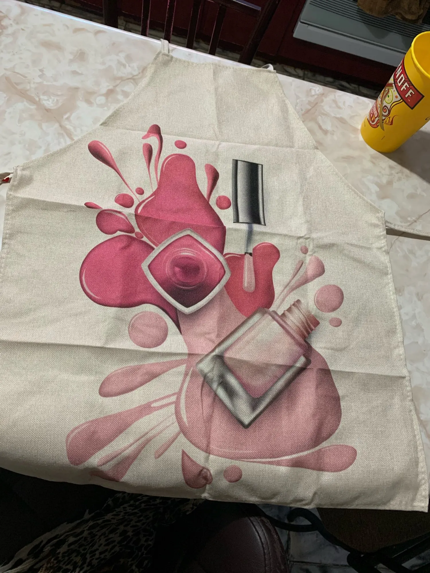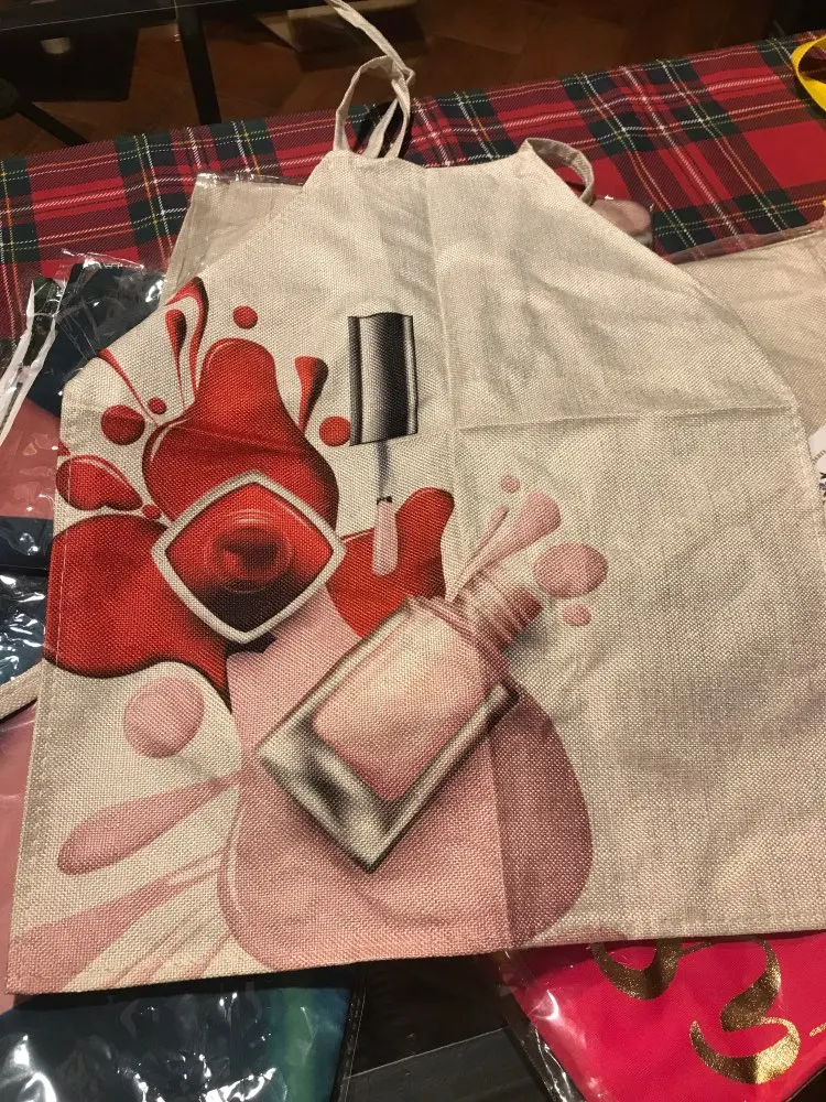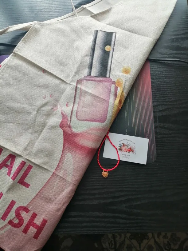 Фартук выполнен из плотной ткани(мешковины) Рисунок яркий, швы ровные. Для работы мастеру маникюра в самый раз. Пыль не пройдёт и материалами не испачкаешься. Если для кухни, конечно не вариант, очень плотный. Доставка до Москвы около месяца. Продавец в подарок положил браслет из красной ните и открытку. Спасибо!