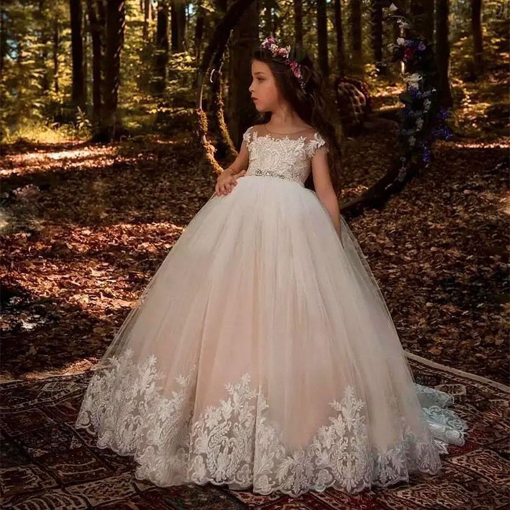 Пышное Бальное платье цвета шампанского в стиле "Лолита", платья для девочек с цветами, детское платье для первого причастия, вечернее платье принцессы с бисером и поясом для девочек