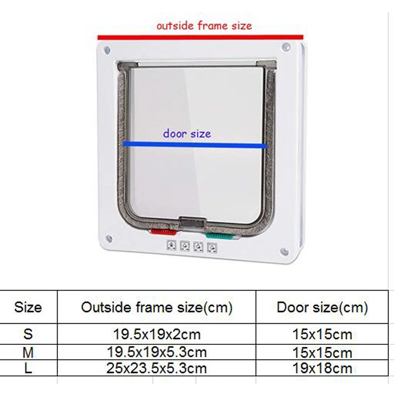 Параметры: Материал: высококачественный абс + акрил Размер: S,M,L Очки размера S очень тонкие! Особенности: * Запираемый, безопасность pet guard * Легко установить, просто зафиксируйте винт * Подходит для всех дверей, заборов, ограждений, панелей * Подходит для кошек и маленьких средних собак