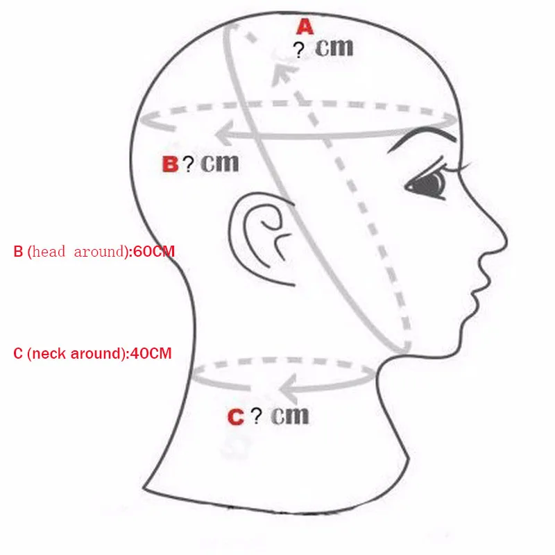 Только один размер (капюшон вокруг (B) составляет около 60 см, шея вокруг (C) около 40 см)