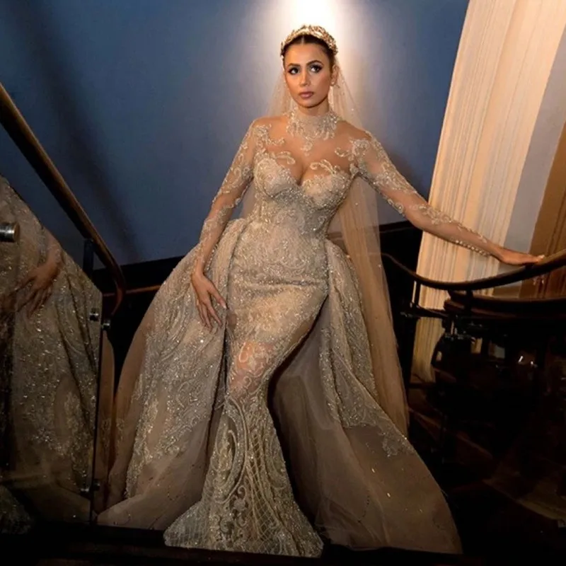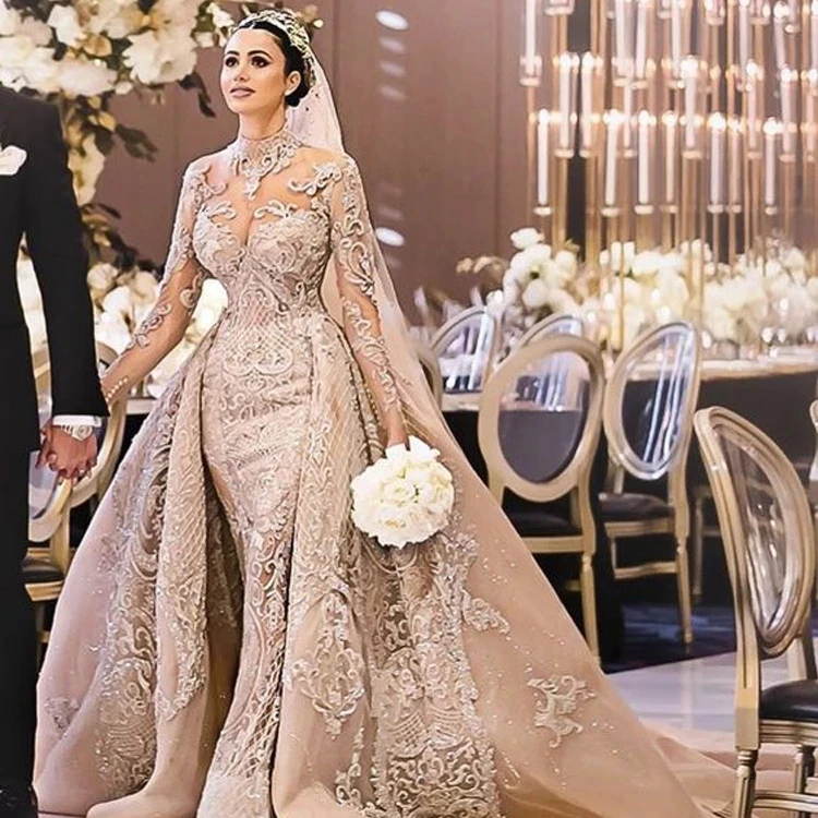 Arabia Свадебные платья Потрясающие abiye полный рукав Свадебные платья цвета шампань бисером формальное платье длинный хвост съемный