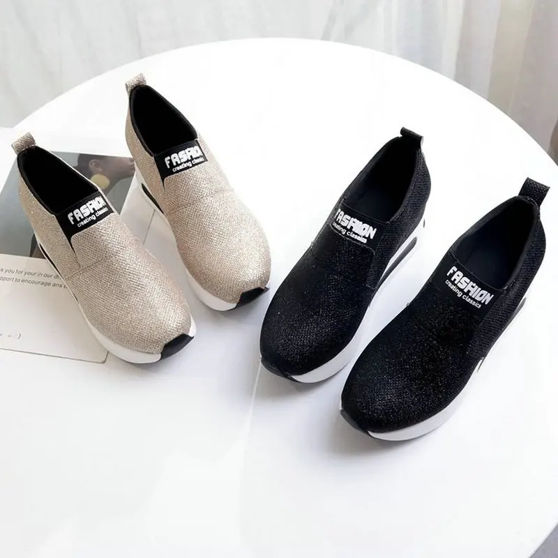 Туфли с блестками; Золотистые и черные кроссовки на танкетке; Женск...