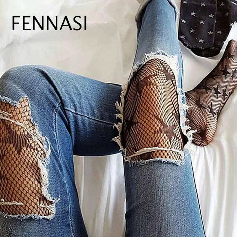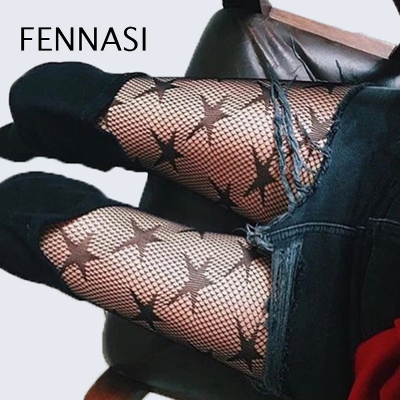 Женские сетчатые колготки FENNASI, черные сетчатые колготки с принтом в виде пентаграммы, эротические колготки, сексуальные прозрачные Модные женские колготки