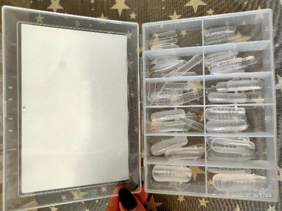 Очень понравился набор. Как раз для широких ногтевых пластин. Закрывающаяся пластмассовая коробка с отделениями. Пришло все целое. Рекомендую товар и продавца.