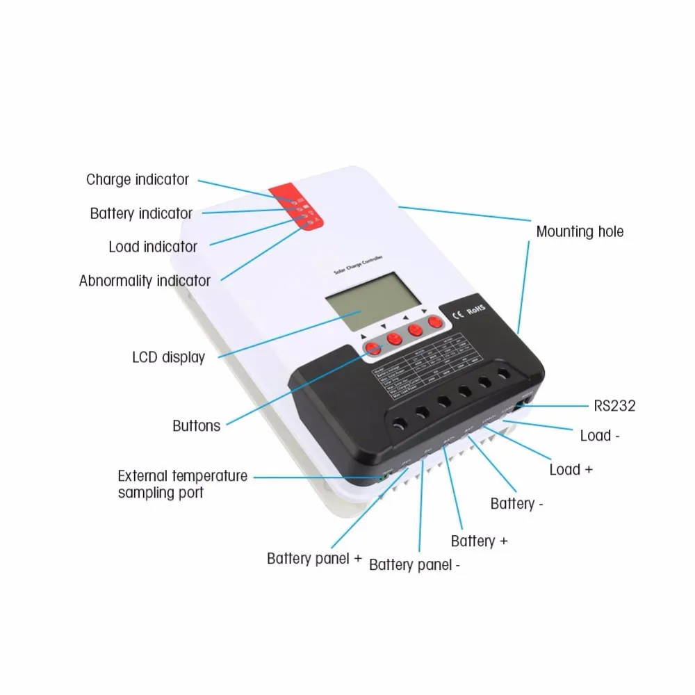• Встроенный алгоритм отслеживания точки максимальной мощности может значительно повысить эффективность использования энергии фотоэлектрических систем и повысить эффективность зарядки на 15% до 20% по сравнению с обычным методом PWM.• Сочетание нескольких алгоритмов отслеживания позволяет точно отслеживать оптимальную рабочую точку на кривой I-V за очень короткое время.• Продукт имеет оптимальную эффективность отслеживания MPPT до 99.9%.• Передовые технологии цифрового источника питания повышают эффективность конверсии энергии до 98%.• Опции программы зарядки доступны для различных типов батарей, включая гелевые батареи, герметичные аккумуляторы, открытые батареи, литиевые батареи и т. д.• Контроллер оснащен ограниченным режимом зарядки. Когда мощность солнечной панели превышает определенный уровень, а зарядный ток больше номинального тока, контроллер автоматически снизит мощность зарядки и доведет зарядный ток до номинального уровня.• Поддерживается мгновенный Запуск большого тока емкостных нагрузок.• Поддерживается автоматическое распознавание напряжения батареи.• Светодиодный индикатор неисправности и ЖК-экран, которые могут отображать информацию о ненормальности, помогают пользователям быстро идентифицировать неисправности системы.• Доступна функция хранения данных в истории, и данные могут храниться до года.• Контроллер оснащен ЖК-экраном, с помощью которого пользователи могут не только проверять операционные данные и состояние устройства, но и изменять параметры контроллера.• Контроллер поддерживает стандартный протокол Modbus, удовлетворяя потребности в связи различных случаев.• Контроллер оснащен встроенным механизмом защиты от перегрева. Когда температура превышает установленное значение, ток зарядки будет снижаться линейной пропорции к температуре, чтобы обуздать повышение температуры контроллера, эффективно удерживая контроллер от повреждения от перегрева.• Благодаря функции компенсации температуры, контроллер может автоматически регулировать параметры зарядки и разрядки, чтобы продлить срок службы батареи.• Защита освещения телевизоров.