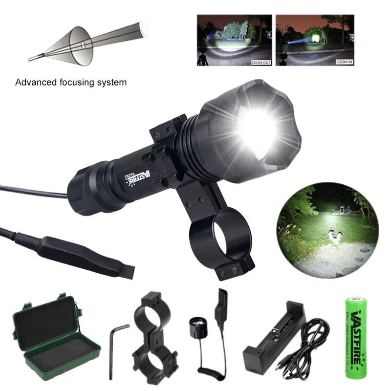 1x белый светильник фонарь 1 аккумулятор 18650 1x зарядное устройство 1x крепление для прицела 1x Дистанционный переключатель давления 1x зеленая коробка