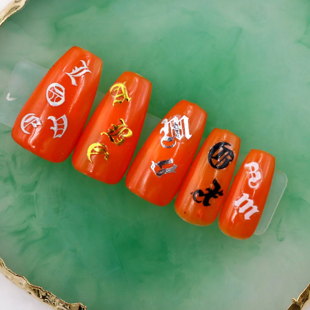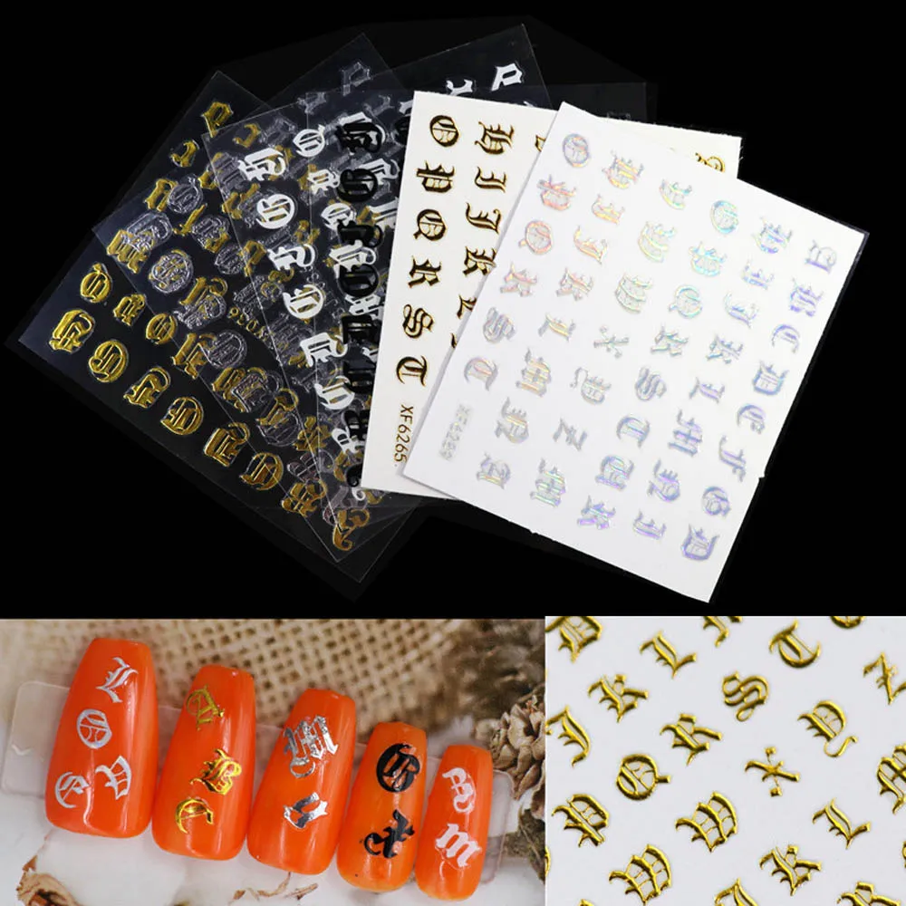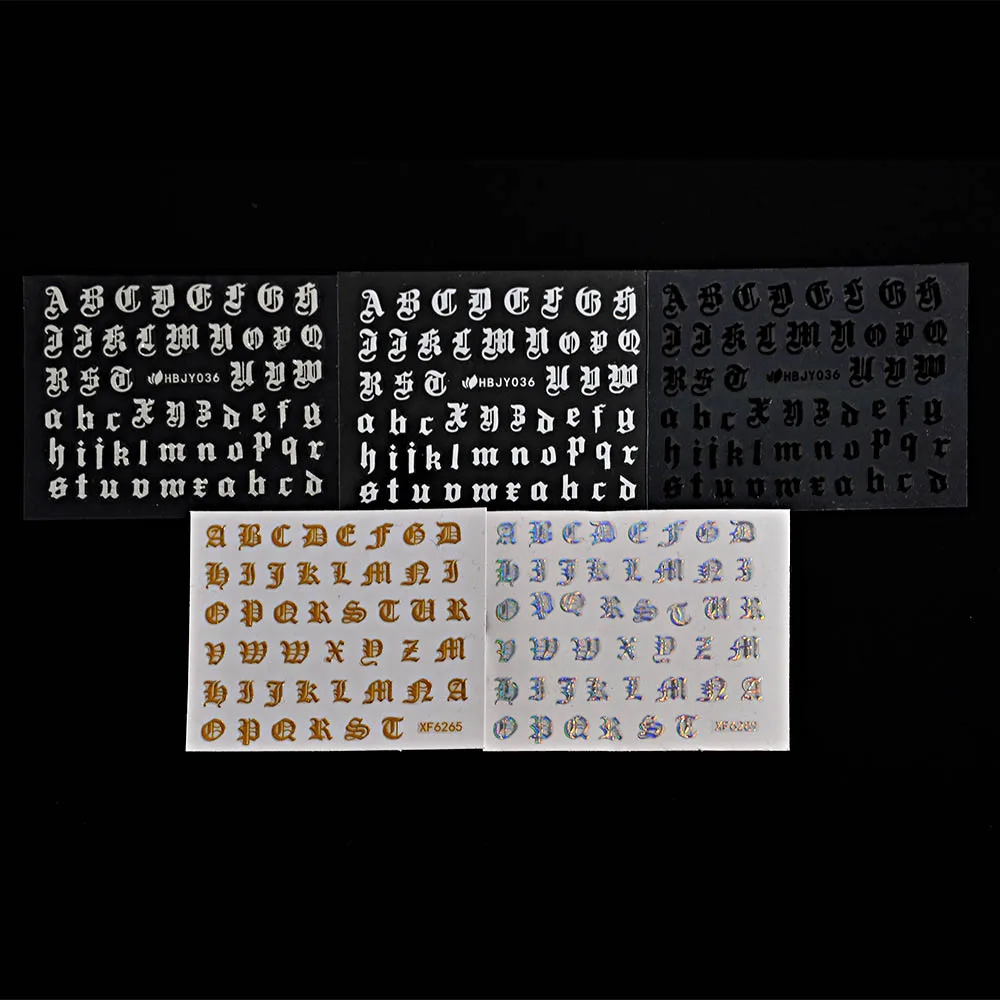 5 листовнабор, Смешанные 3D наклейки для ногтей с буквами, сделай сам, самоклеющиеся нестандартные наклейки на Старый Английский алфавит, различные стойкие украшения для ногтей