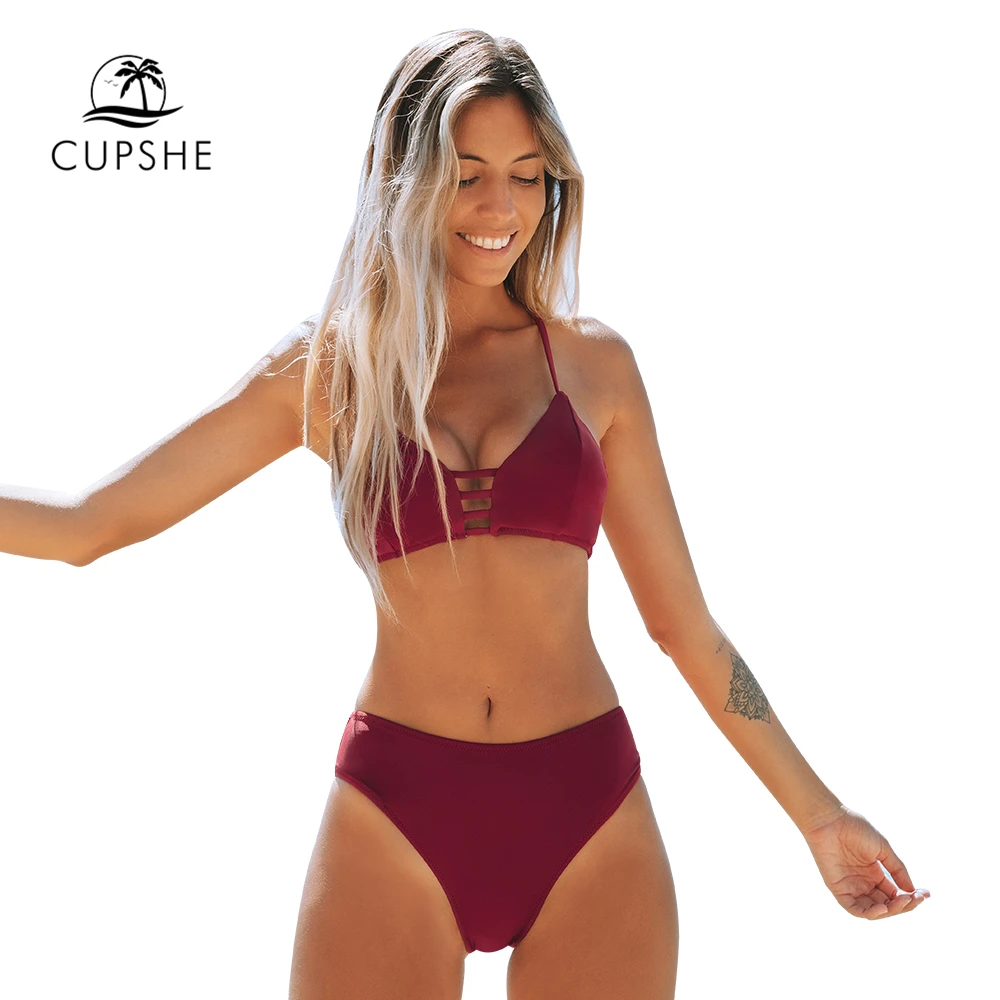 CUPSHE, Одноцветный, винно-красный, на бретельках, бикини, наборы, сексуальный, средняя талия, майка, топ, купальник, две части, купальник для женщин, 2020, пляжные купальники