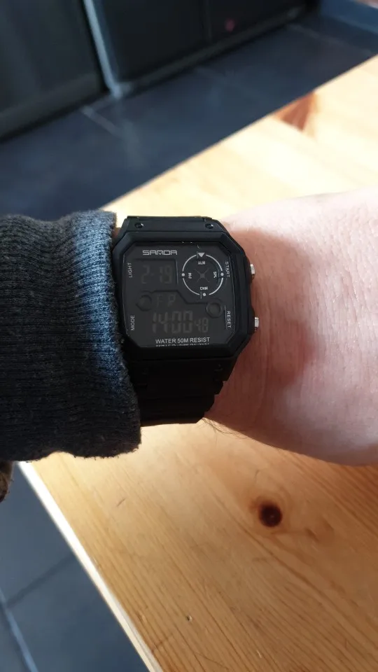 Черные часы с черным ЖК-экраном (Серые цифры) не считывают данные о времени даже при дневном свете. Это не просто и не удобно использовать часы-почти всегда вы должны включить подсветку, чтобы проверить время-не хорошо. Часы легкие и на ощупь качество хорошее, кнопки стабильные. Немного странная конфигурация кнопок, но это не проблема.
