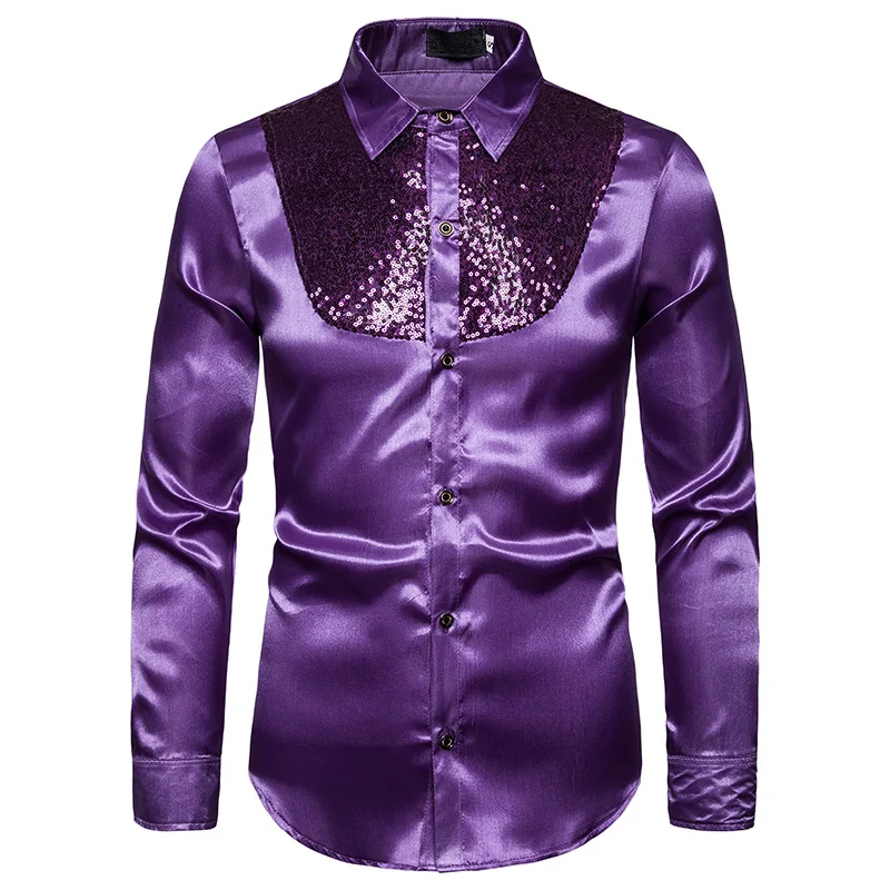 Мужская шелковая рубашка в стиле пэчворк, фиолетовая атласная рубаш...