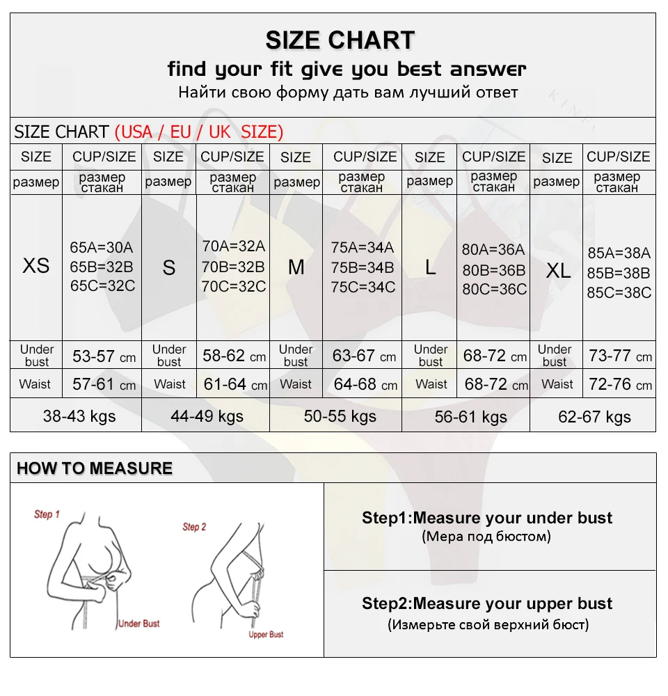 Как выбрать размер?Например, если вы носите Британский Размер 36B, вы можете подобрать размер в таблице размеров, выберите размер M или если вы выберете европейский размер 80C, то вы можете подобрать размер в таблице размеров, выберите размер L. Если вы не уверены в своем размере, пожалуйста, свяжитесь с нами. Мы поможем вам найти ваш размер.