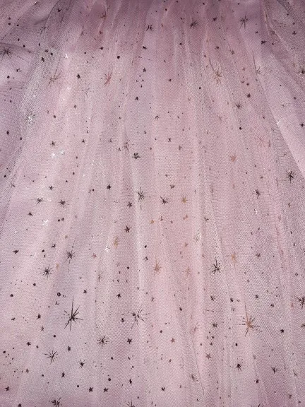 Платье ниже колен. Верх хлопок с принтом. Юбка три слоя. 1 - белая хлопковая ткать, 2 - цельный розовый фатин, 3 - несколько полотнищ фатина разных цветов, наложенным друг на друга. Швы обработаны, есть даже этикетка с составом.