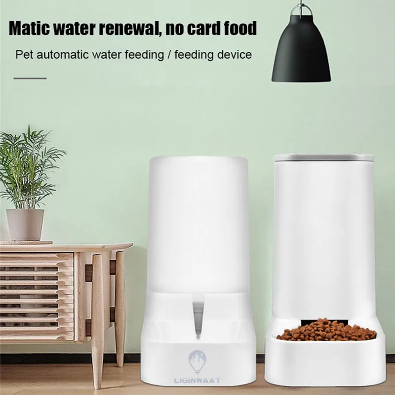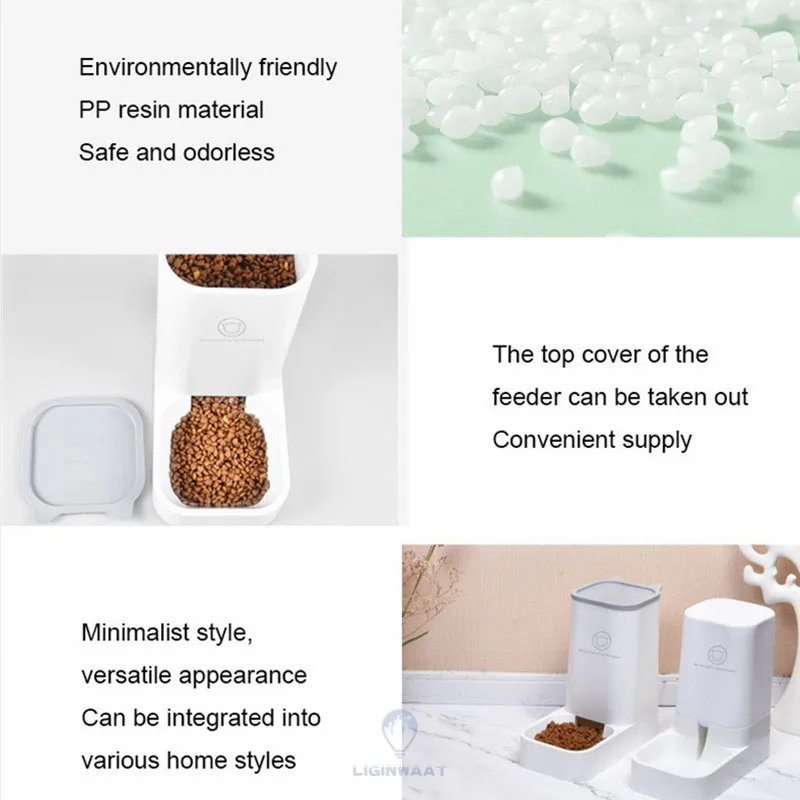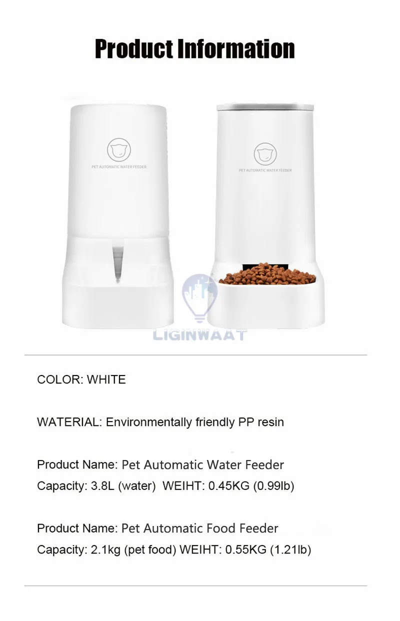 -Цвет: белый -Материал: Экологически чистая полипропиленовая смола -Бренд: LIGINWAAT -Подходит для: кошек и собак -Название продукта: автоматическая кормушка для воды для домашних животных -Емкость: 3,8 л (вода) -Вес: 0,45 кг (0,99 фунта) -Название продукта: устройство автоматической кормушки для домашних животных -Производительность: 2,1 кг (сухой корм для животных) -Вес: 0,55 кг (1,21 фунта)