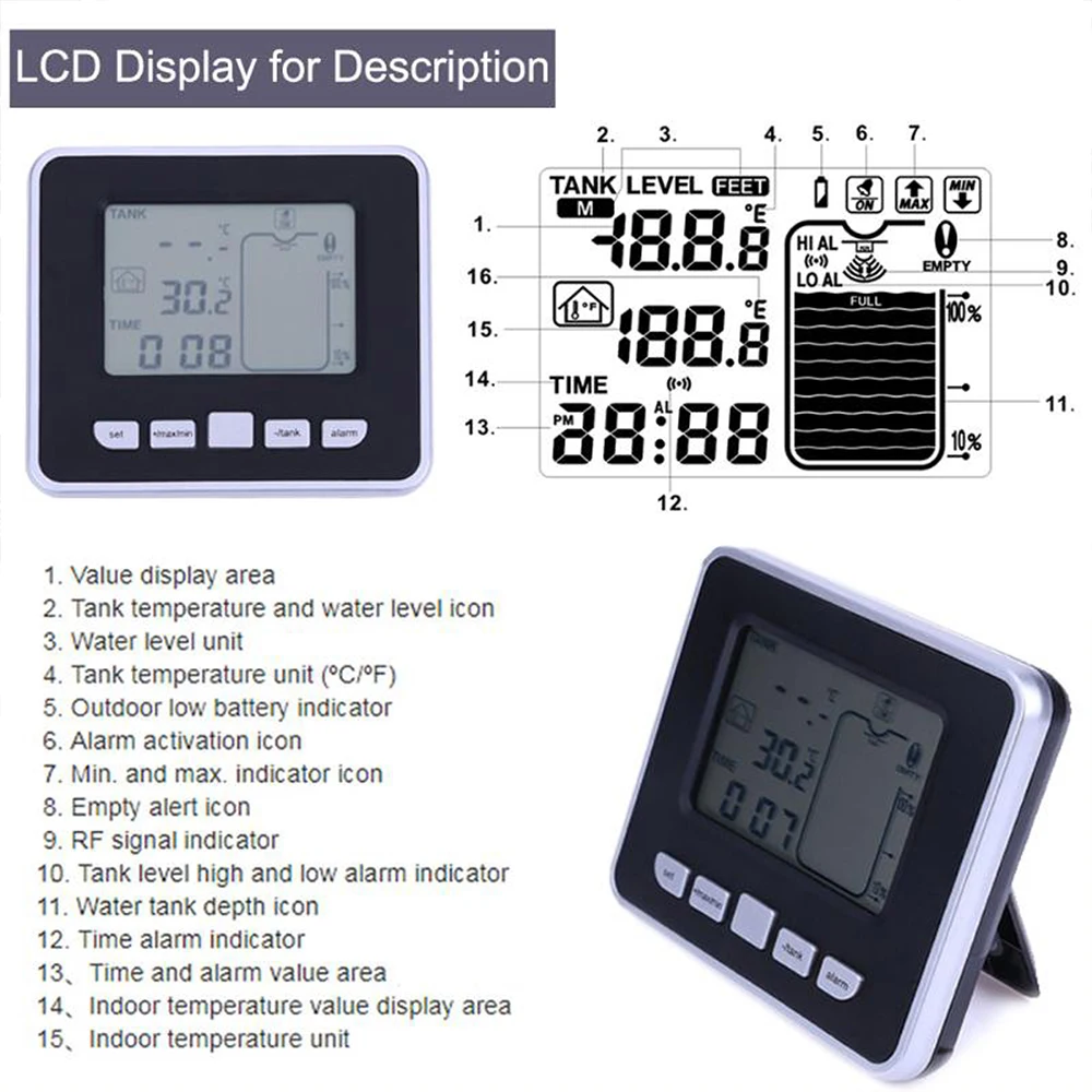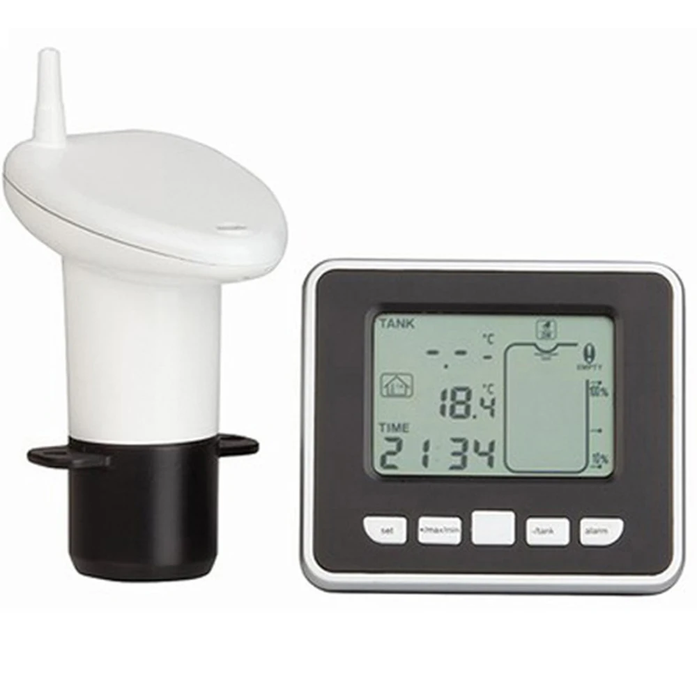 Описание: Держите глаз на открытом резервуаре для воды от комфорта вашей собственной гостиной, до 100 м. Вы можете повесить приемник на стену или вытащить подставку и разместить ее на своем кухонном столе или столе. Диапазон измерения: диапазон температуры в помещении: 0 ~ 60 °; Диапазон температуры на открытом воздухе: -40 ~ 60 °; Точность температуры: ± 1 °. Датчик уровня воды измерения Диапазон: 0 ~ 15 м, Разрешение: 0,01 м, точность: +/-0,03 М. Отображает температуру в помещении (° или °) и температуру в резервуаре (° или °) одновременно. Вид вашей комнаты температуры, температуры и датчик уровня воды (представлены в 10 элемент столбчатую диаграмму). Вы можете хранить минимальную/максимальную запись и устанавливать сигналы тревоги для конкретных уровней воды (высокий/Низкий) или когда пустой. Особенности: 1. Контролирует уровень глубины жидкости в резервуаре 2. Уровня жидкости бака отображается на 10-элемент ЖК-дисплей столбчатую диаграмму 3. Мин/Макс записи уровня жидкости в баке 4. Высокий/Низкий уровень жидкости в резервуаре 5. Резервуар для жидкости 6. Температура в помещении (или oC) 7. Температура бака (или oC) 8. Будильник времени 9. Отдельно стоящий или настенный подвесной Спецификация: Материал: пластик. Размер приемника: 10,5*9,3*2,5 см. Размер передатчика: 15,5*6,5*9,5 см. Диапазон температуры в помещении: 0 ~ 60 °. Наружный Температурный диапазон: -40 ~ 60 °. Точность температуры: ± 1 ° Измерение уровня воды: 0 ~ 15 м. Разрешение: 0,01 М. Точный: +/-0,03 М. Частота передачи: 433 МГц. Дальность передачи: 100 метров (300 футов) на открытой местности. Интервал передачи: 30 с при изменении уровня или 3 минуты, когда уровень не изменяется. Приемник Батарея: 2X AA 1,5 V LR3 щелочные батареи типа АА (не входят в комплект). Батарея передатчика: 6X AAA 1,5 V LR6 щелочные или литиевые батареи (не входят в комплект). Упаковочный лист