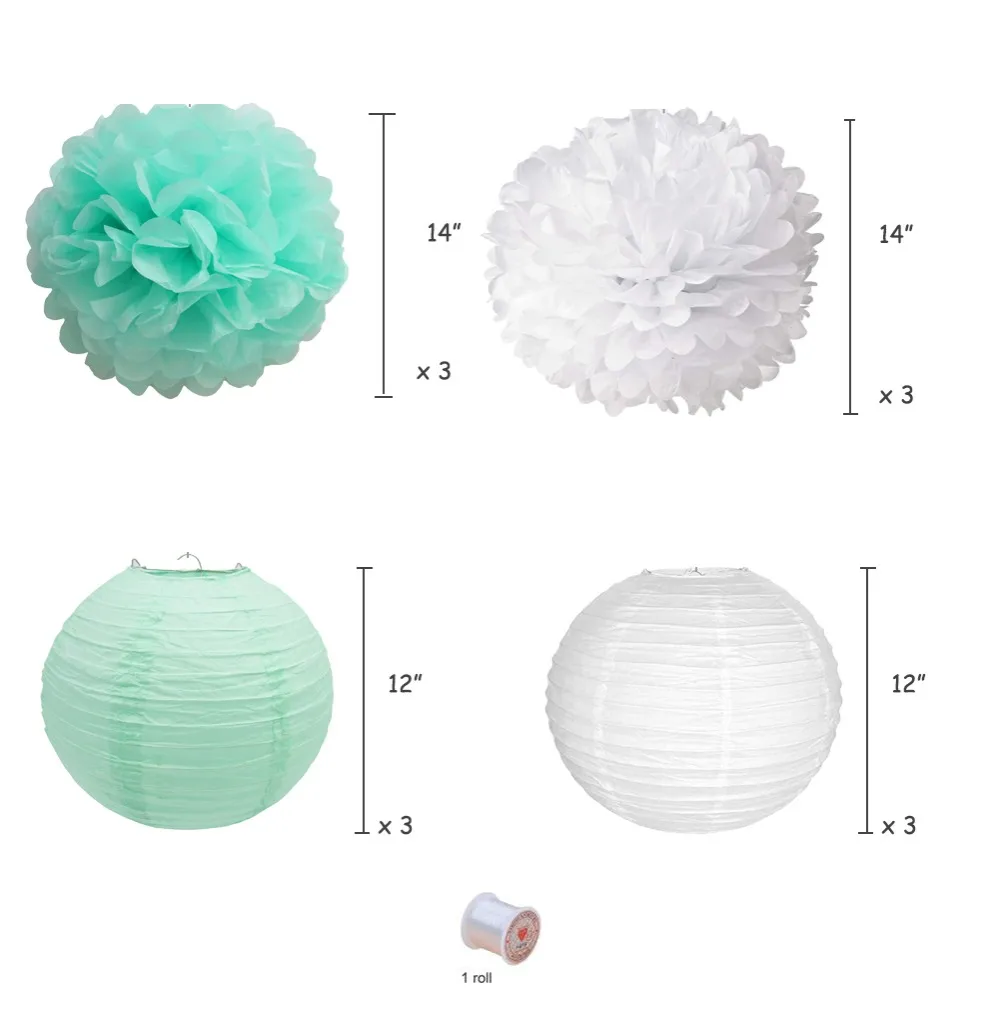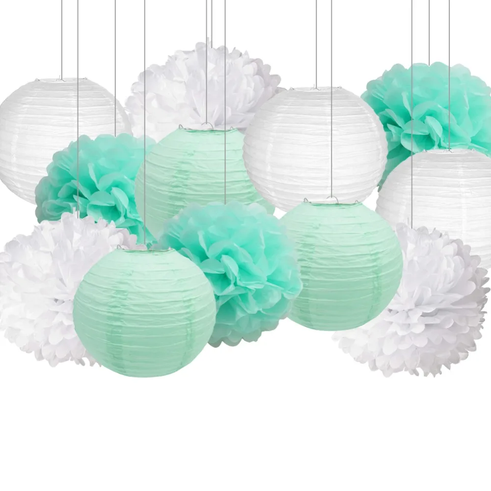 Красивое прикосновение к вашей вечеринке: разноцветные белые и мятно-зеленые бумажные помпоны и бумажные фонарики могут быть прекрасным дополнением к вечернему подвесному украшению или потрясающим столу