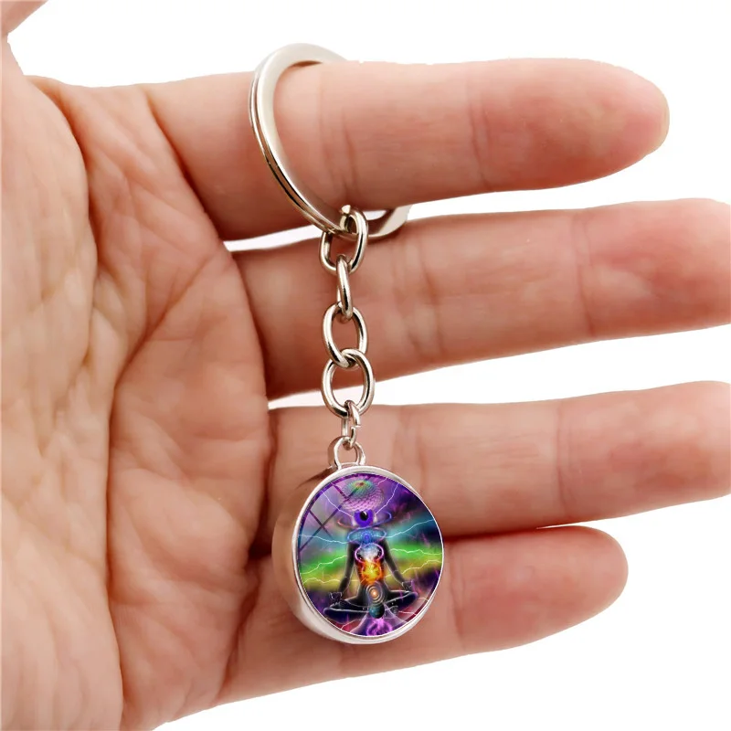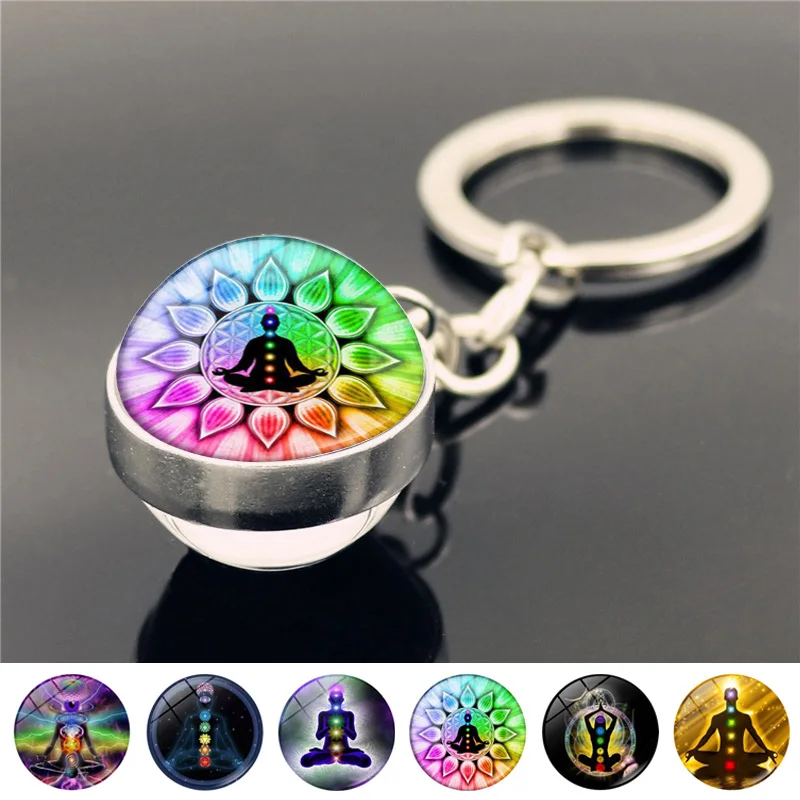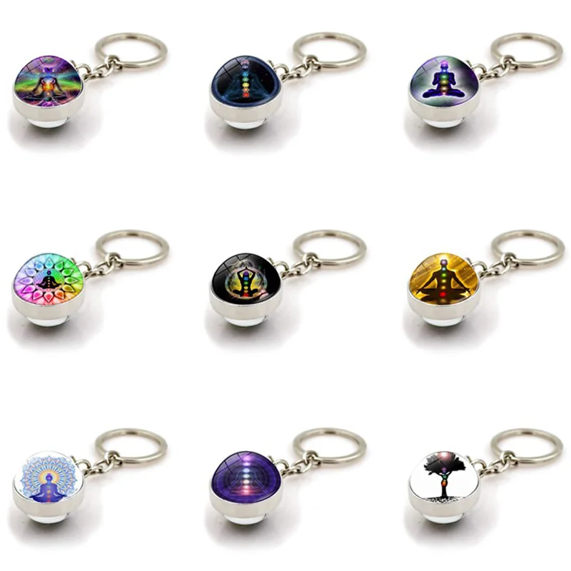 7 Чакра символ йоги Ом брелок Подвеска индийская медитация ювелирные изделия модный двухсторонний стеклянный шар брелок для ключей для мужчин женщин