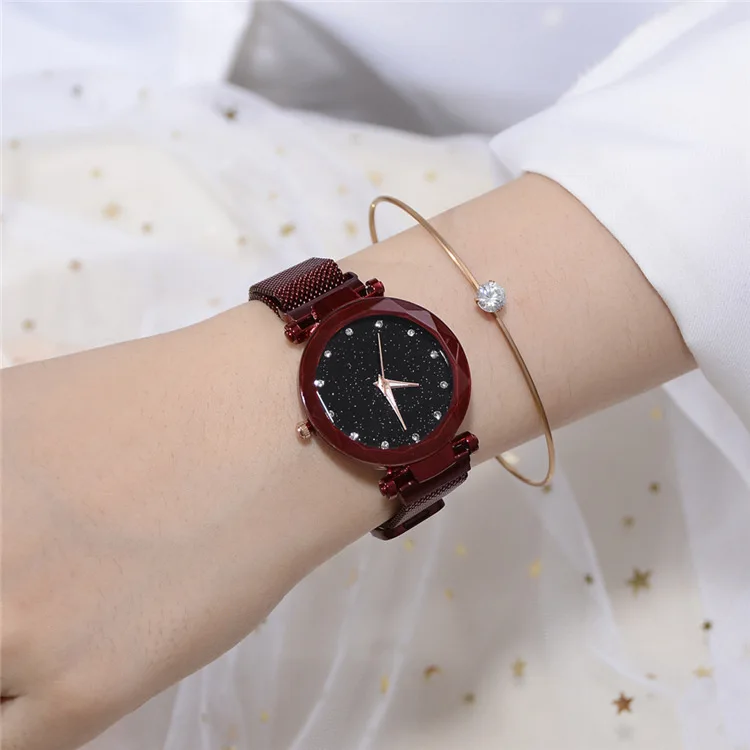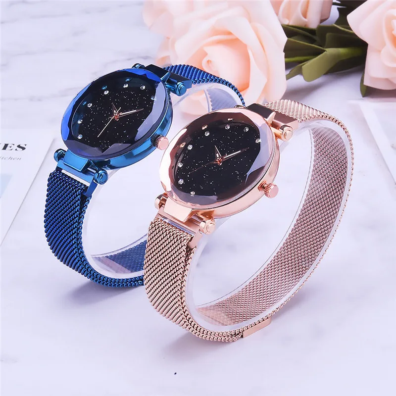 Часы наручные женские кварцевые с пряжкой, аналоговые модные с браслетом звездного неба из нержавеющей стали, с сетчатым магнитным механизмом