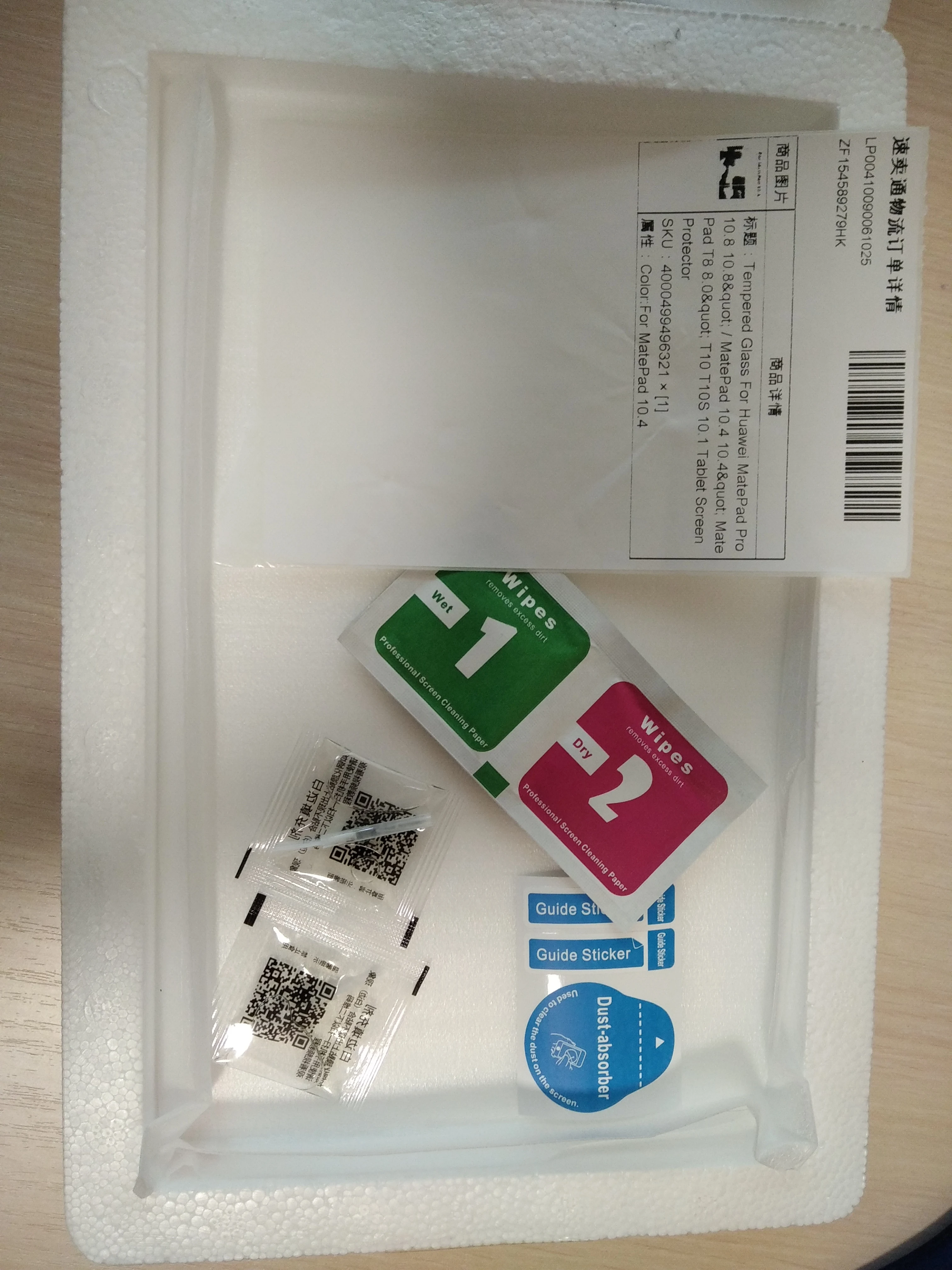 Заказал 2 стекла на matepad t10s, шли до Минска чуть меньше 2 месяцев, заказ частично отслеживался(заказал 07.10.2020, а пришли 30.11 2020). Стёкла пришли целые, к каждому стеклу в комплекте шла влажная и сухая салфетка, направляющие стикеры и стикер для убирания пыли, а также по 2 пакетика с кисточкой жидкостью от воздушных пятен по краям(не пригодилась, стекло клеится полностью, без воздуха по краям)